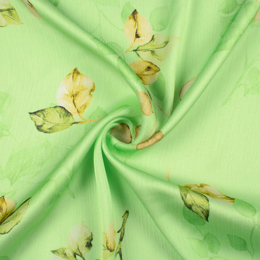 Lime Green And Beige Leaf Pattern Digital Print Chiffon Satin Fabric Lime Green And Beige Leaf Pattern Digital Print Chiffon Satin Fabric