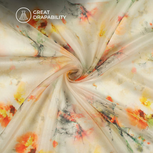 White And Orange Floral Printed Organza Satin Fabric White And Orange Floral Printed Organza Satin Fabric