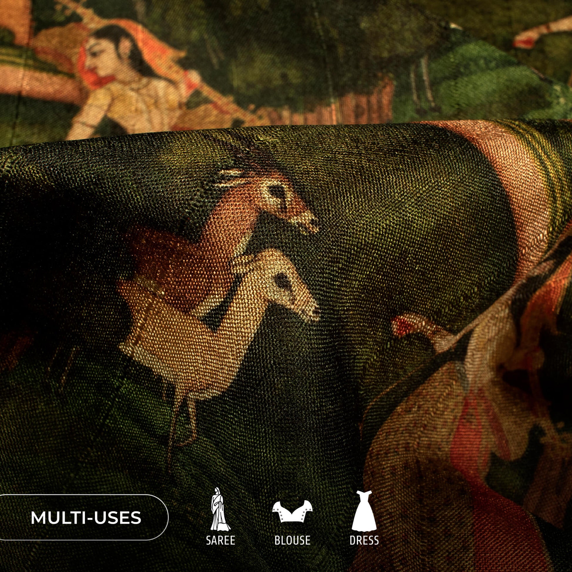 Green And Brown Madhuvanii Printed Art Tusser Silk Fabric