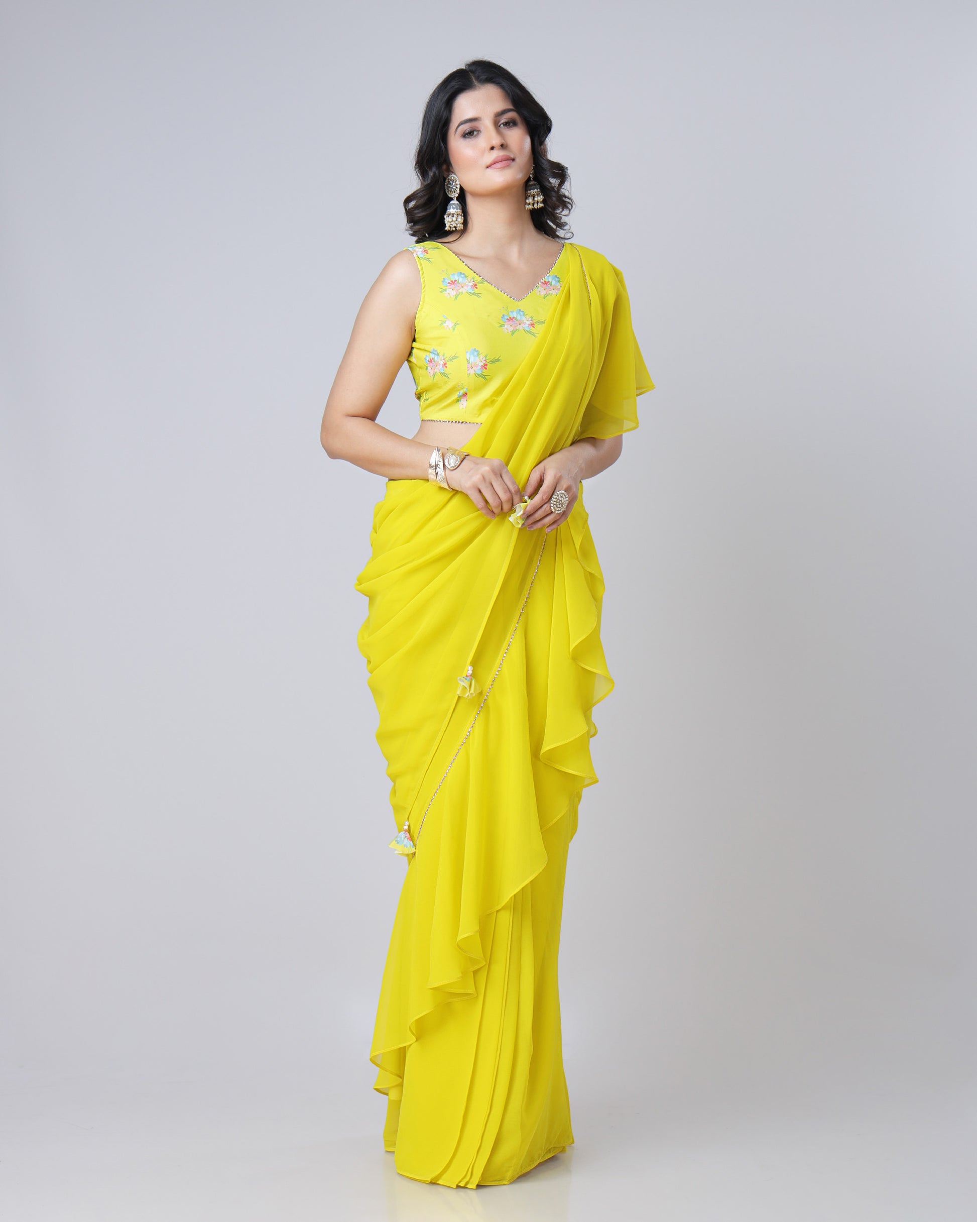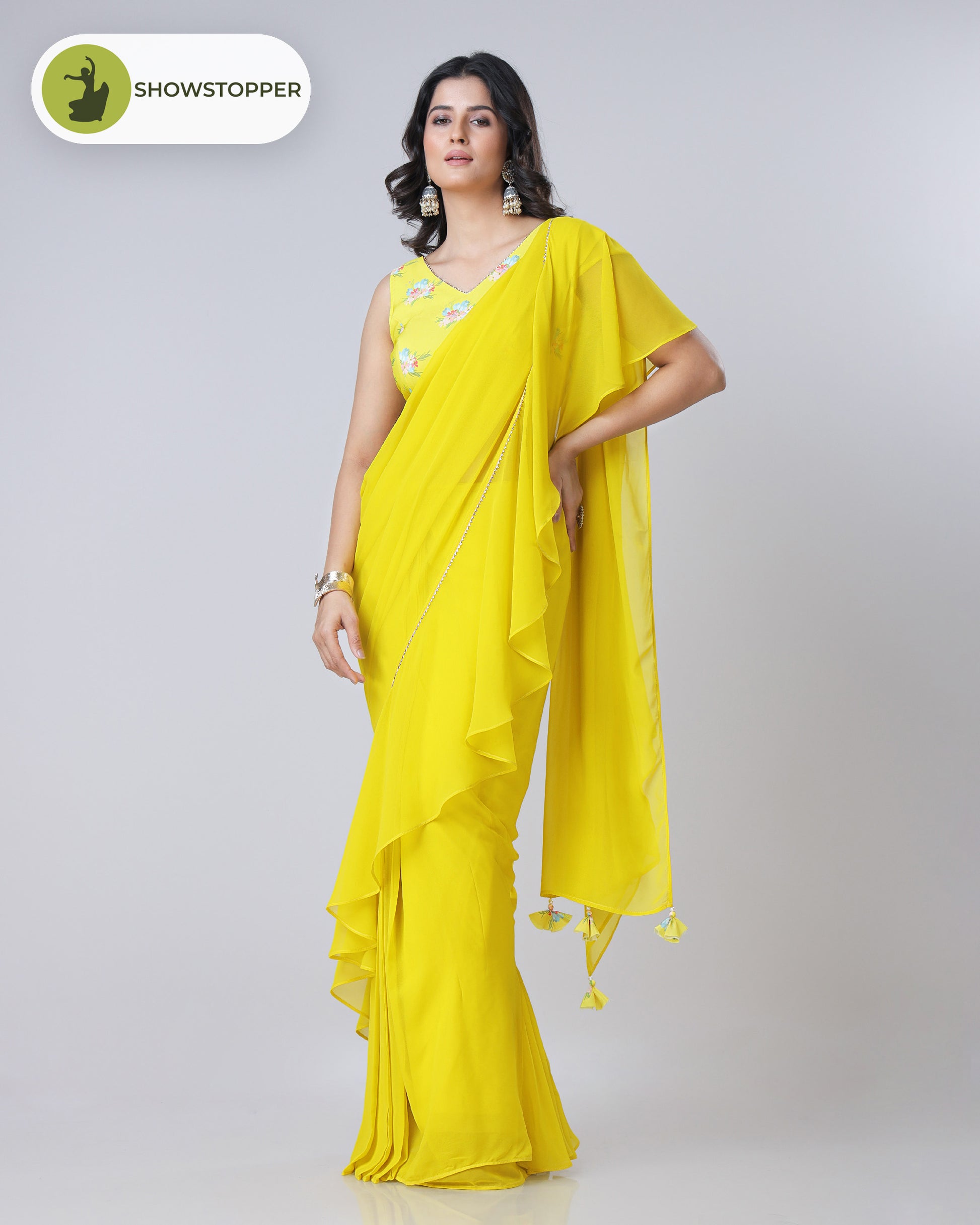 Classic Cadium Yellow Ruffled Designer Pre-Draped Saree