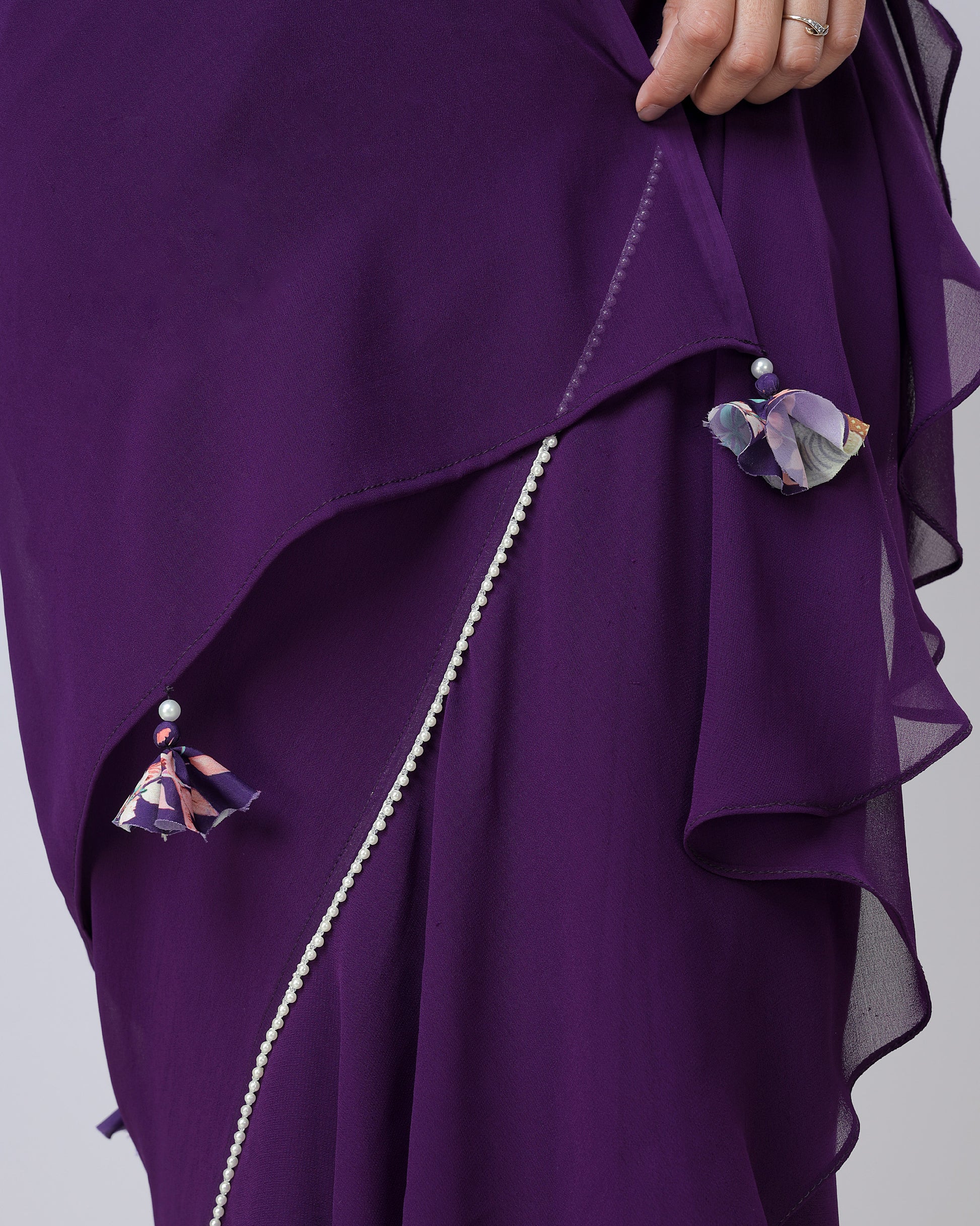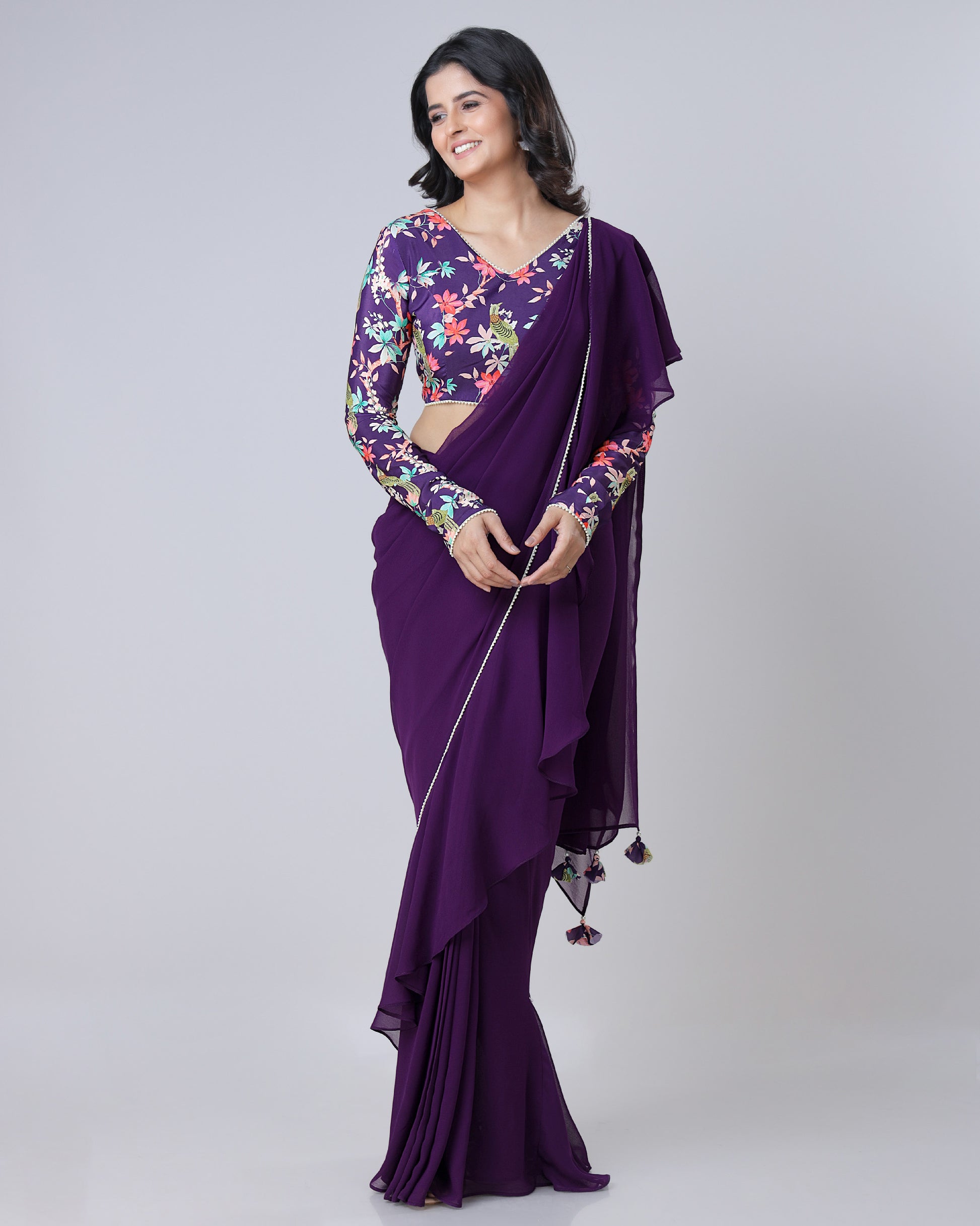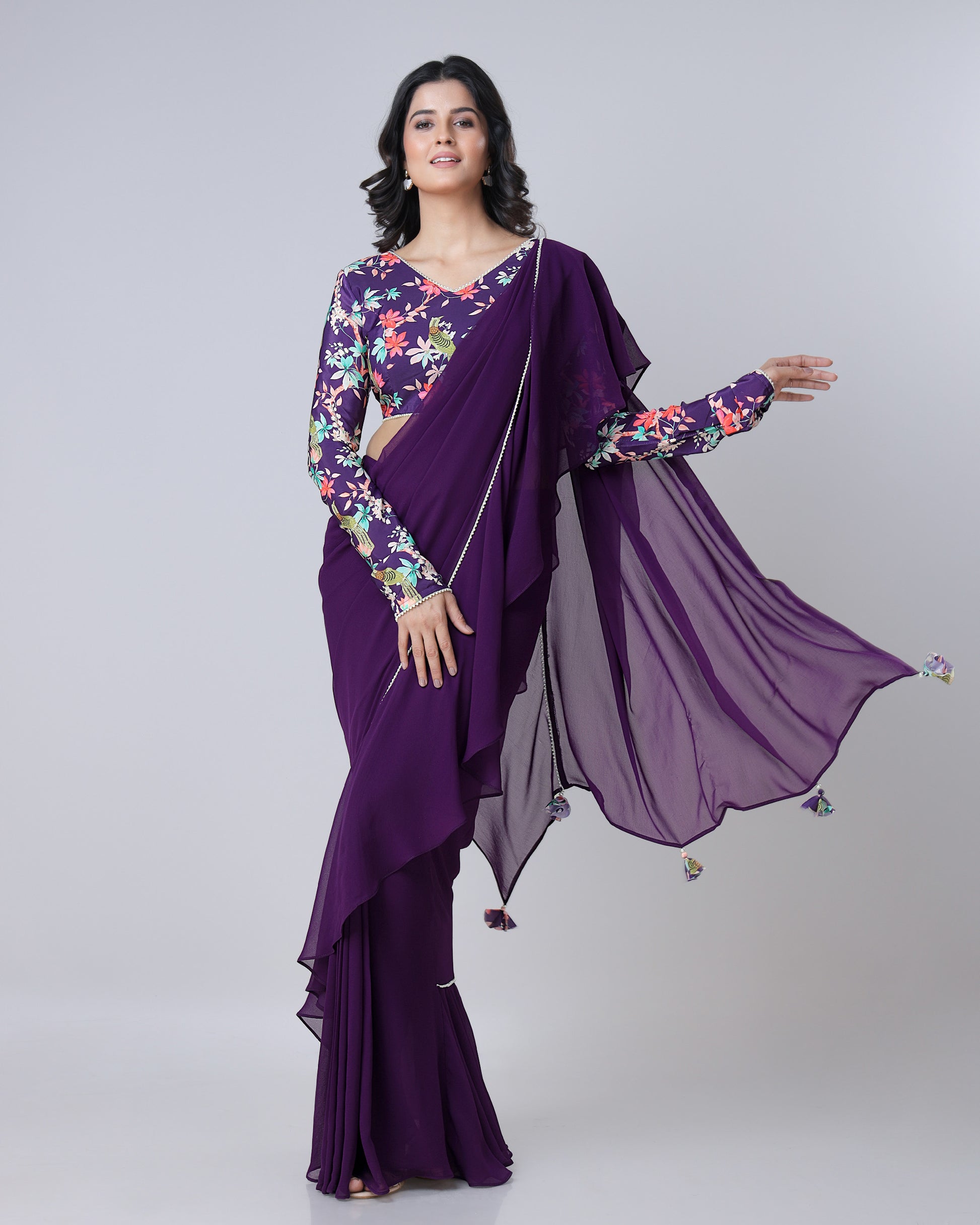 Classic Indiigo Purple Ruffled Designer Pre-Draped Saree