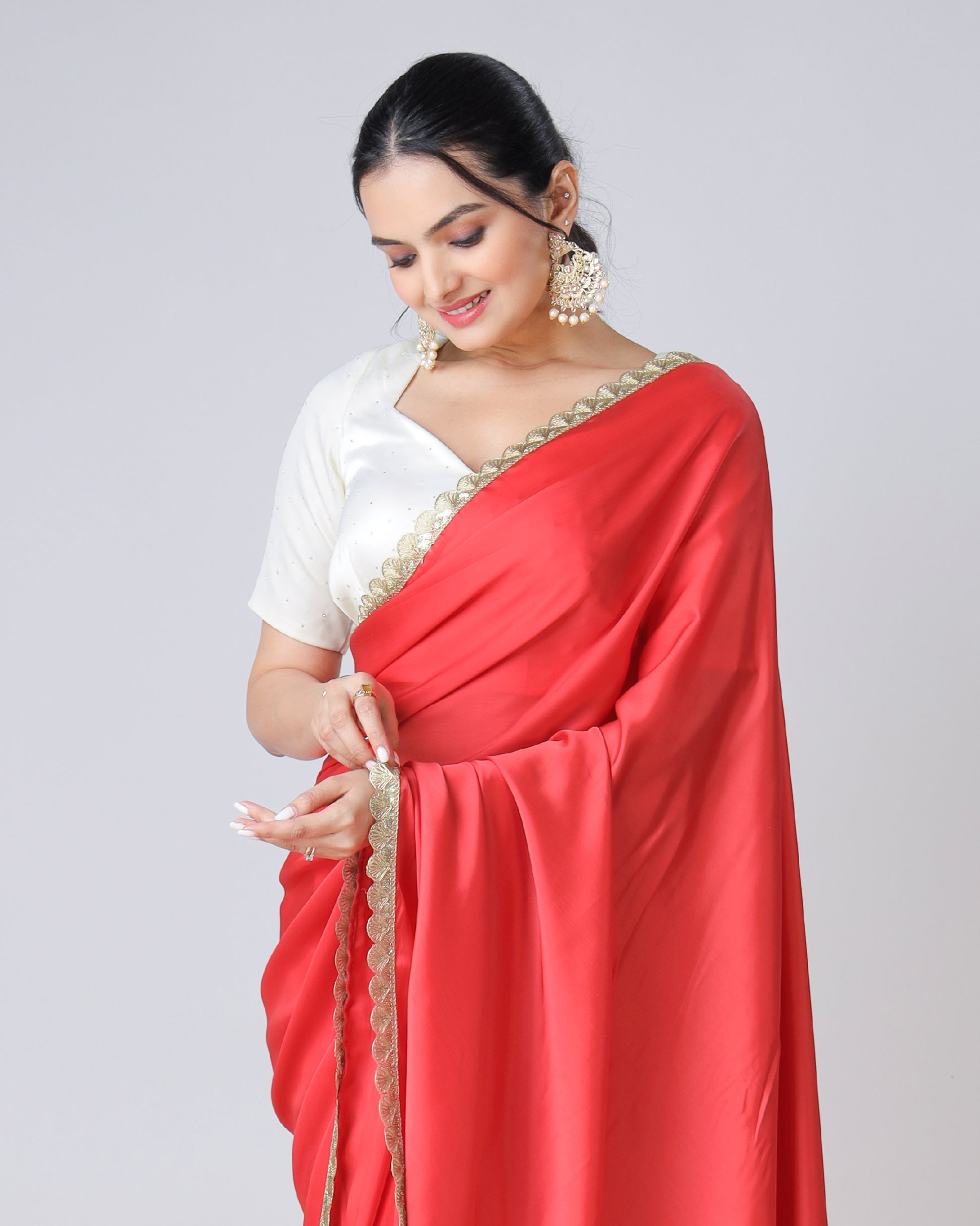 Vermilion Red Stunning Designer Saree With Romantic Lacework Touch