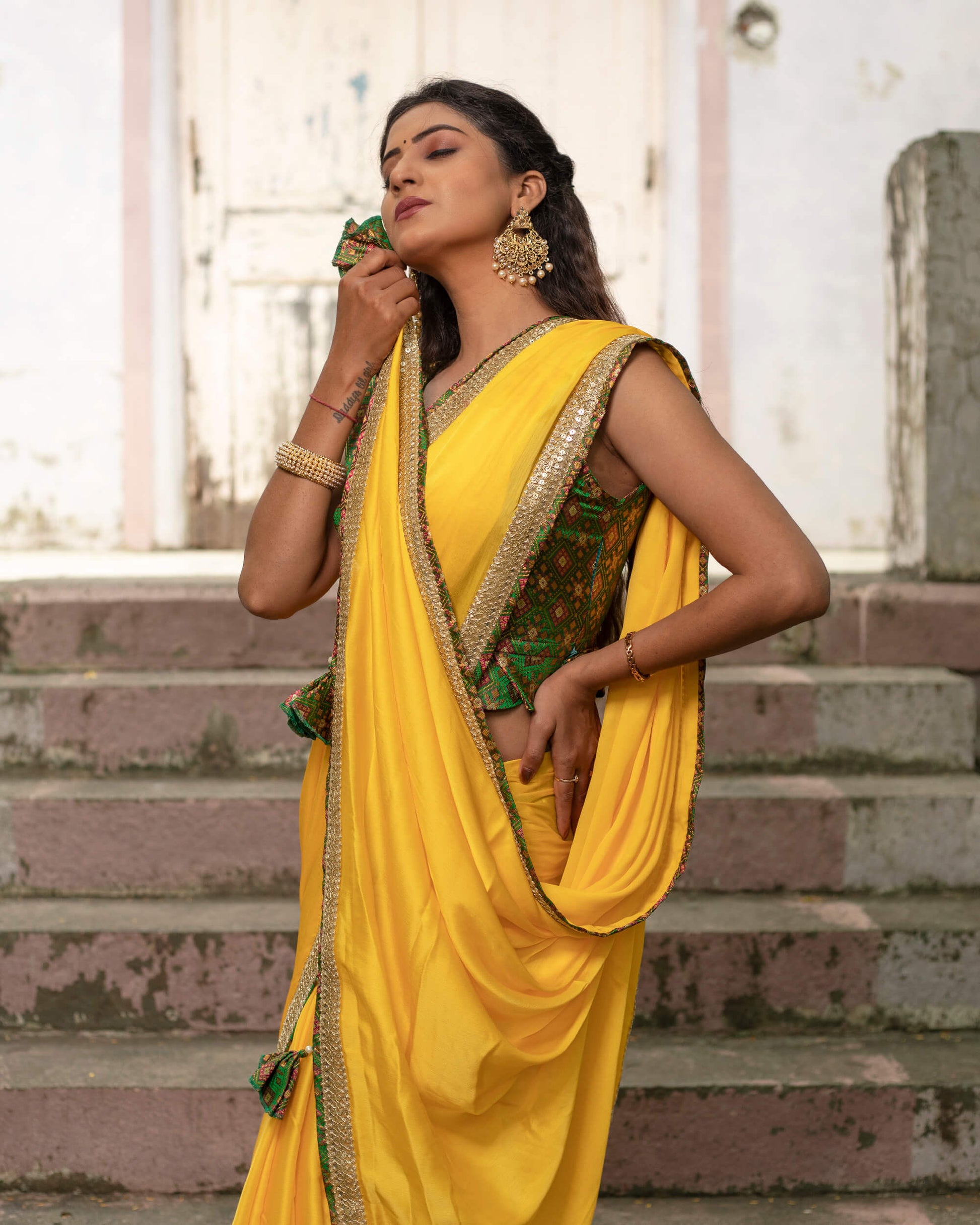 Fabcurate's saree collection will upgrade your dressing style. It is made from Chiffon satin and hence offering a wide range of qualities. Wear a class and be a trend maker, with these new sets of sarees. This yellow plain saree is designed beautifully and can be worn for all kinds of occasions. Made with matching lace, it enhances the beauty of the saree. Chiffon Satin is lightweight, breathable, and has a nice drape. You can buy it with a matching blouse too.