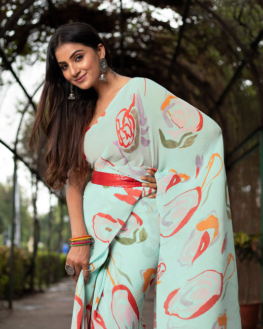 -25% offBaby Blue And Vermilion Red Quirky Pattern Digital Print Georgette Pleated Saree Baby Blue And Vermilion Red Quirky Pattern Digital Print Georgette Pleated Saree