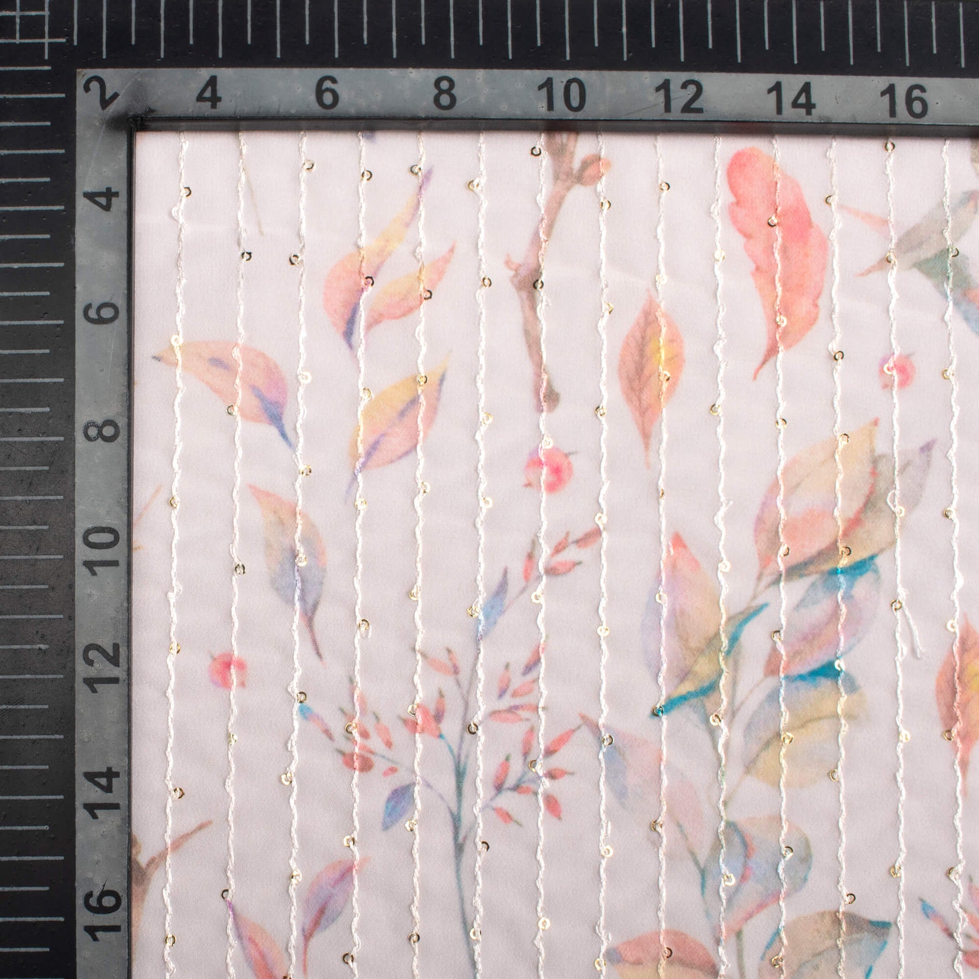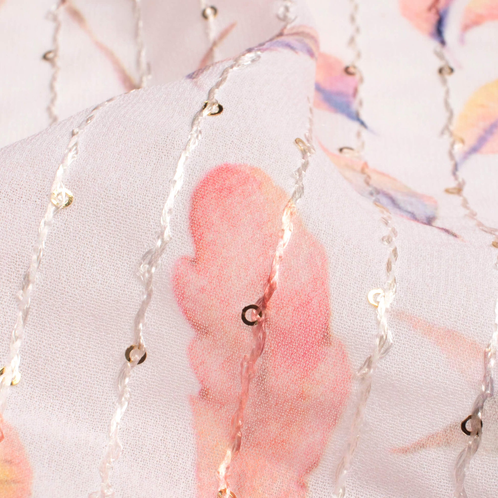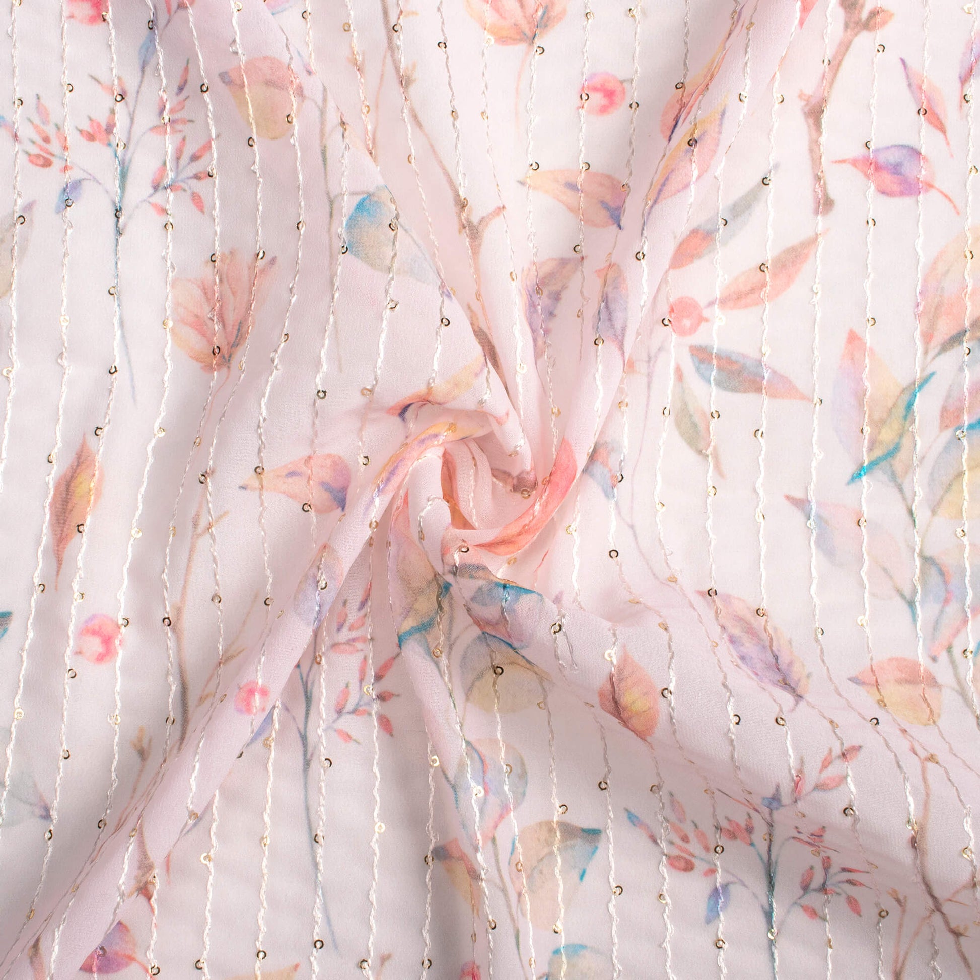 Baby Pink And Blush Red Leaf Pattern Digital Print Premium Sequins Georgette Fabric
