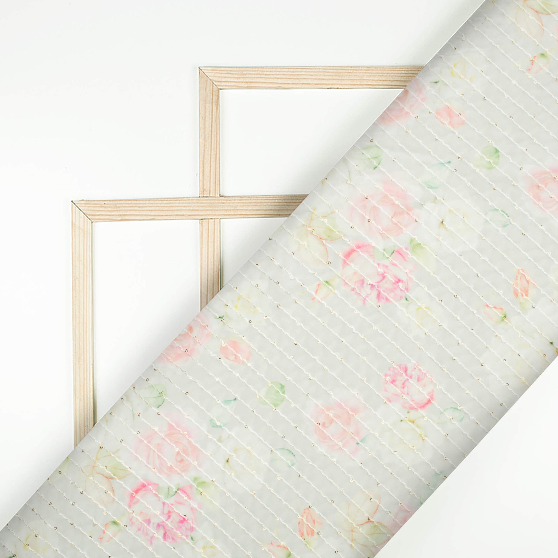 Dolphin Grey And Carnation Pink Floral Pattern Digital Print Premium Sequins Georgette Fabric