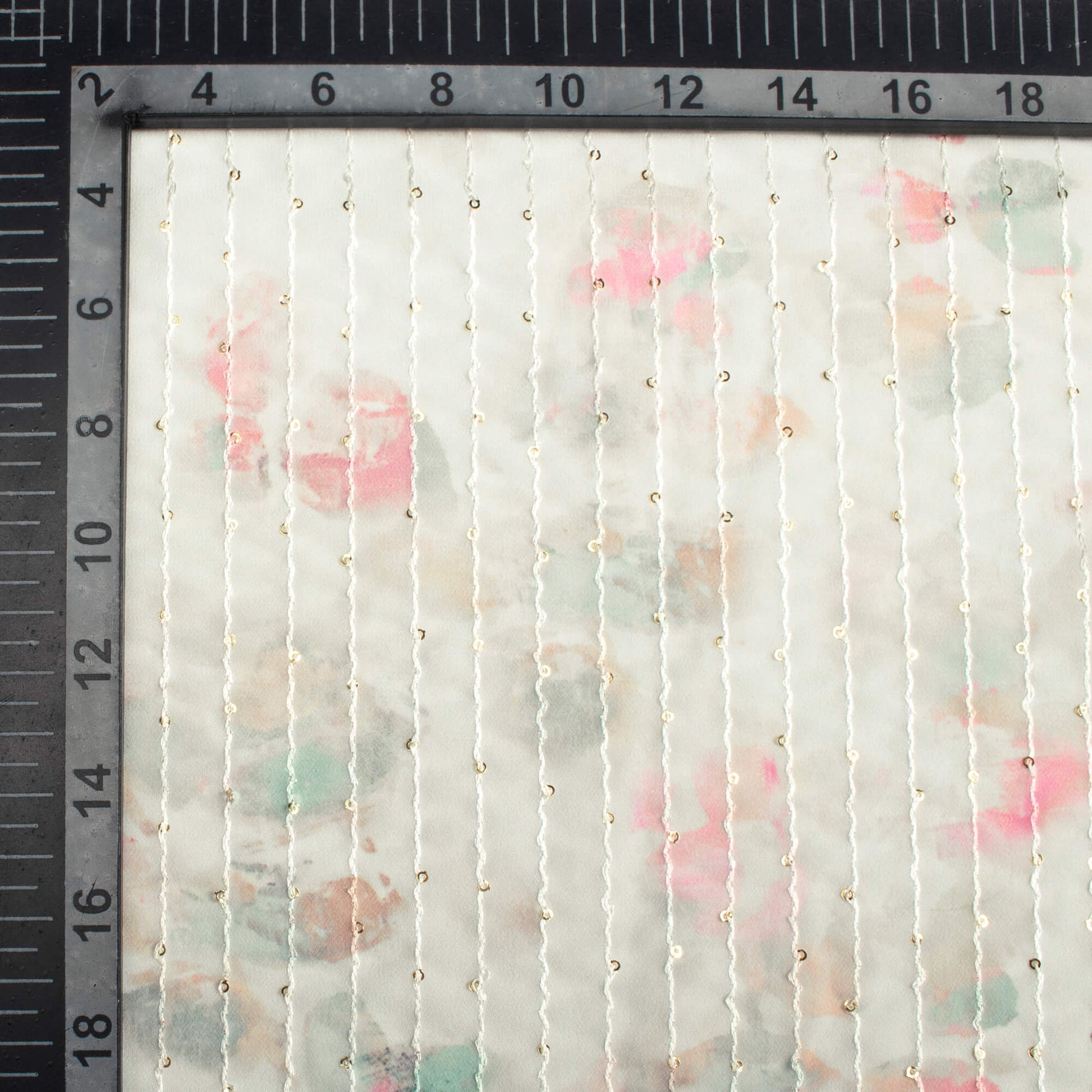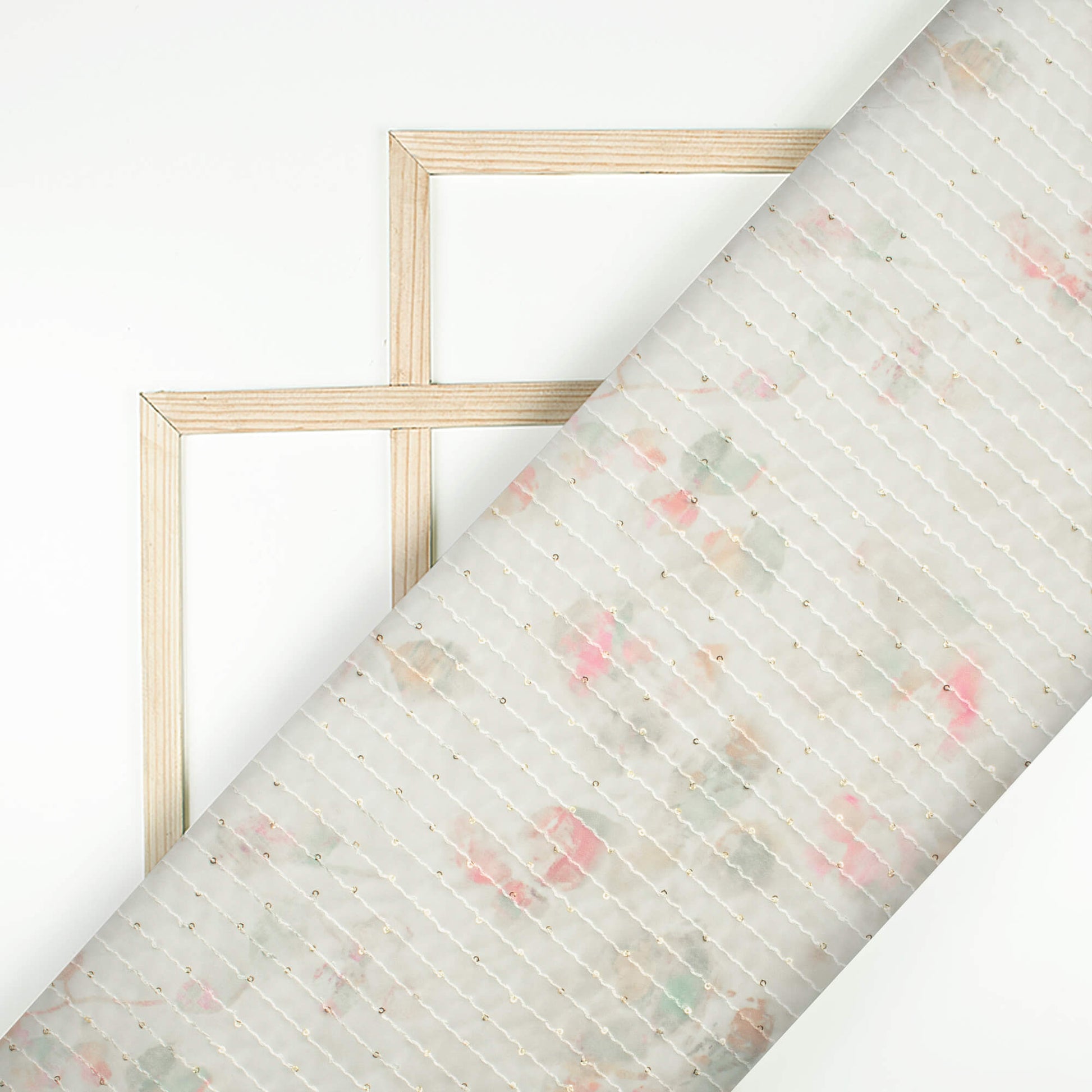 Dolphin Grey And Pink Leaf Pattern Digital Print Premium Sequins Georgette Fabric
