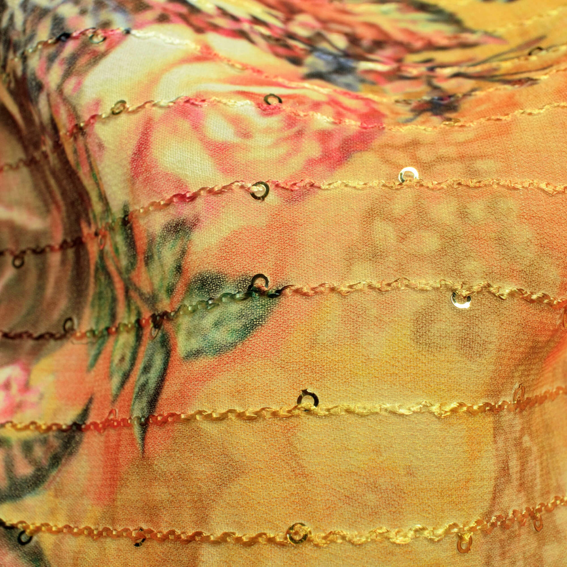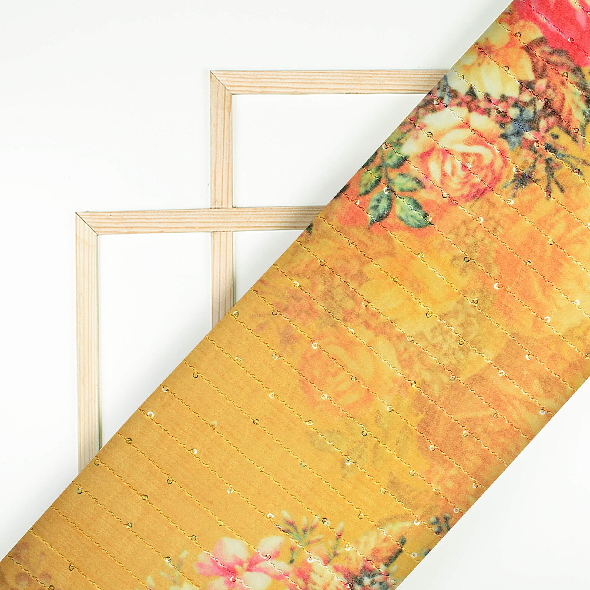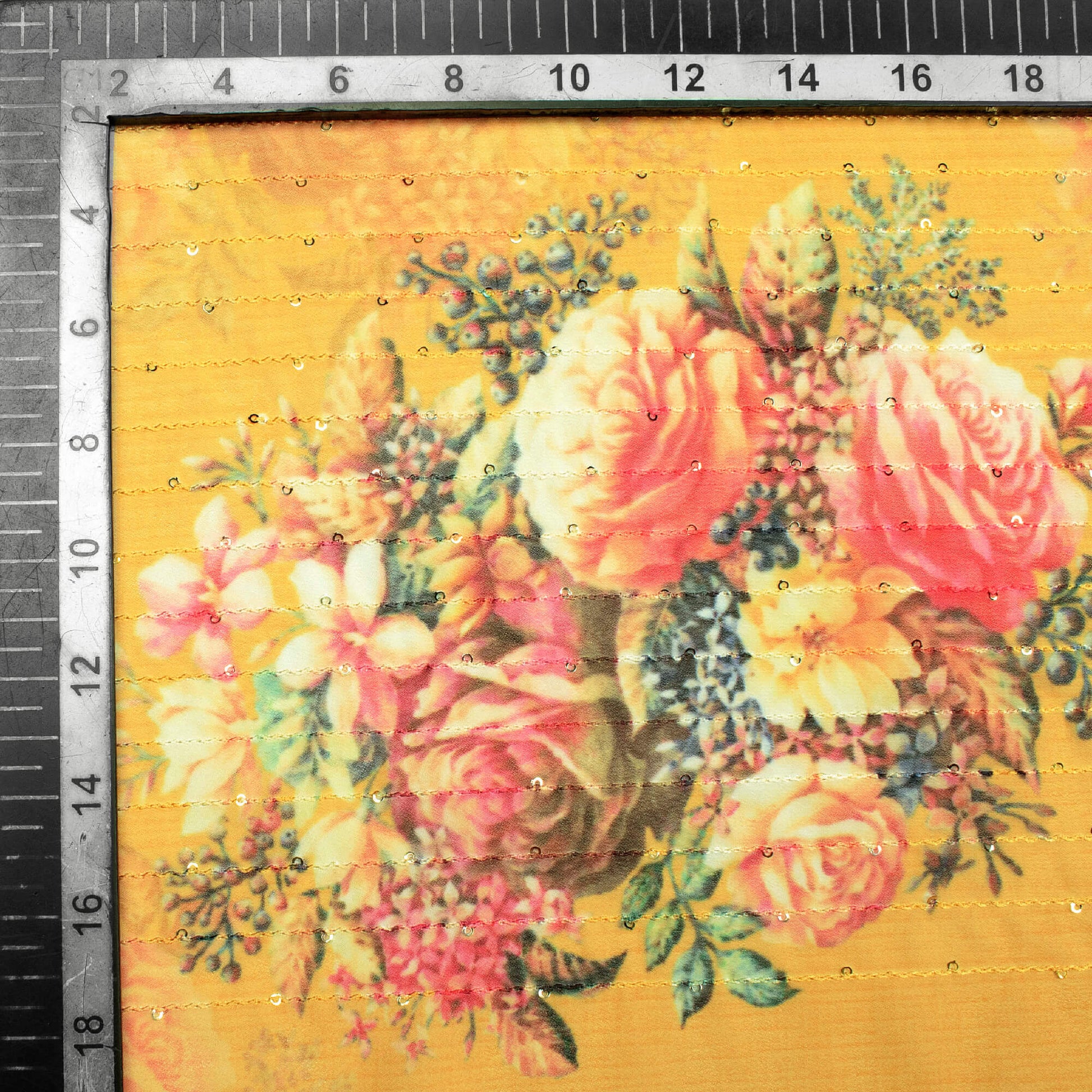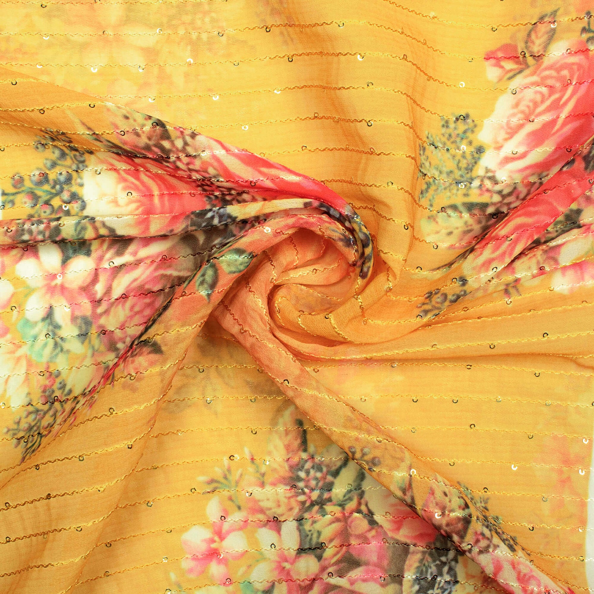 Honey Yellow And Orange Floral Pattern Digital Print Premium Sequins Georgette Fabric