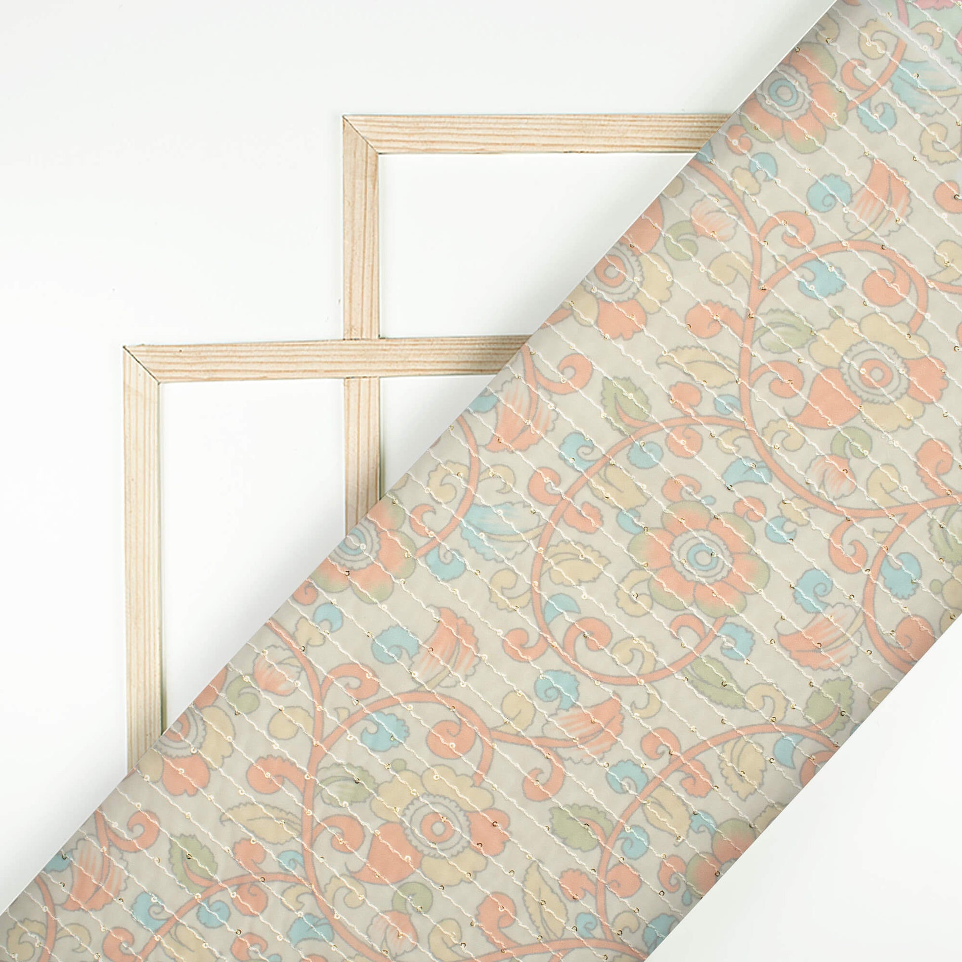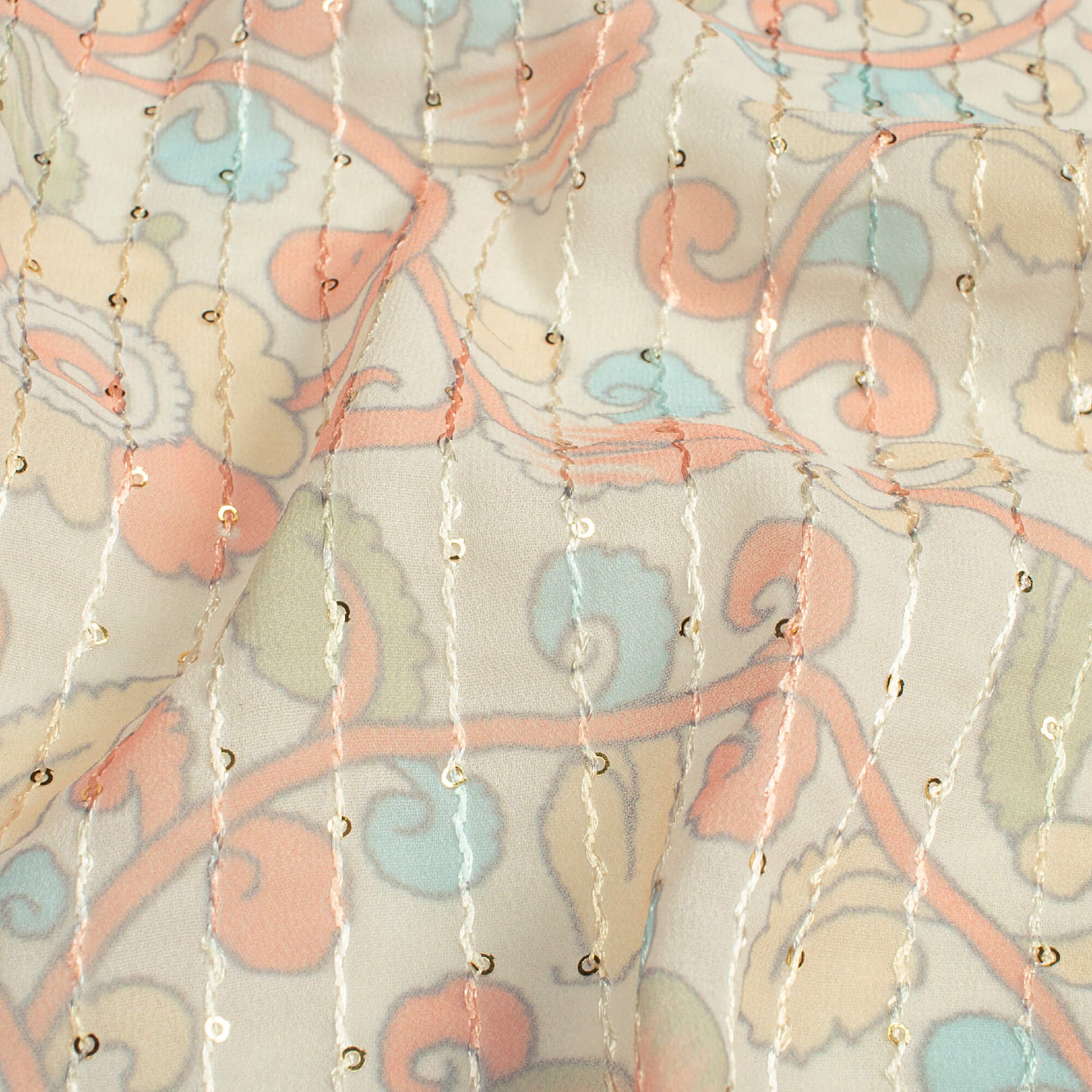 Oat Beige And Coral Peach Kalamkrii Pattern Digital Print Premium Sequins Georgette Fabric