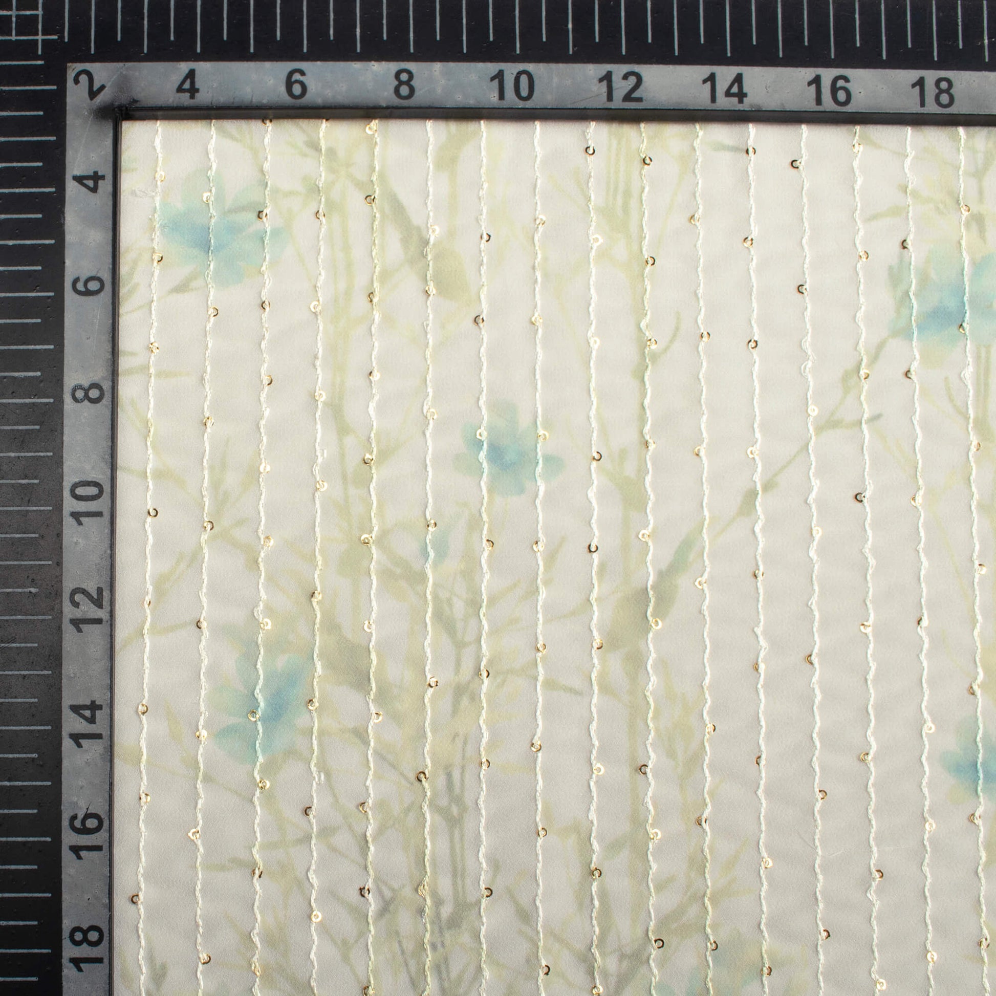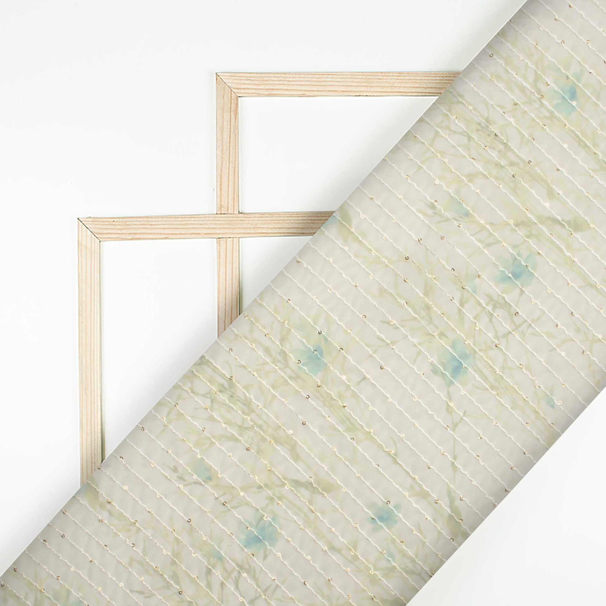 Oat Beige And Olive Green Floral Pattern Digital Print Premium Sequins Georgette Fabric