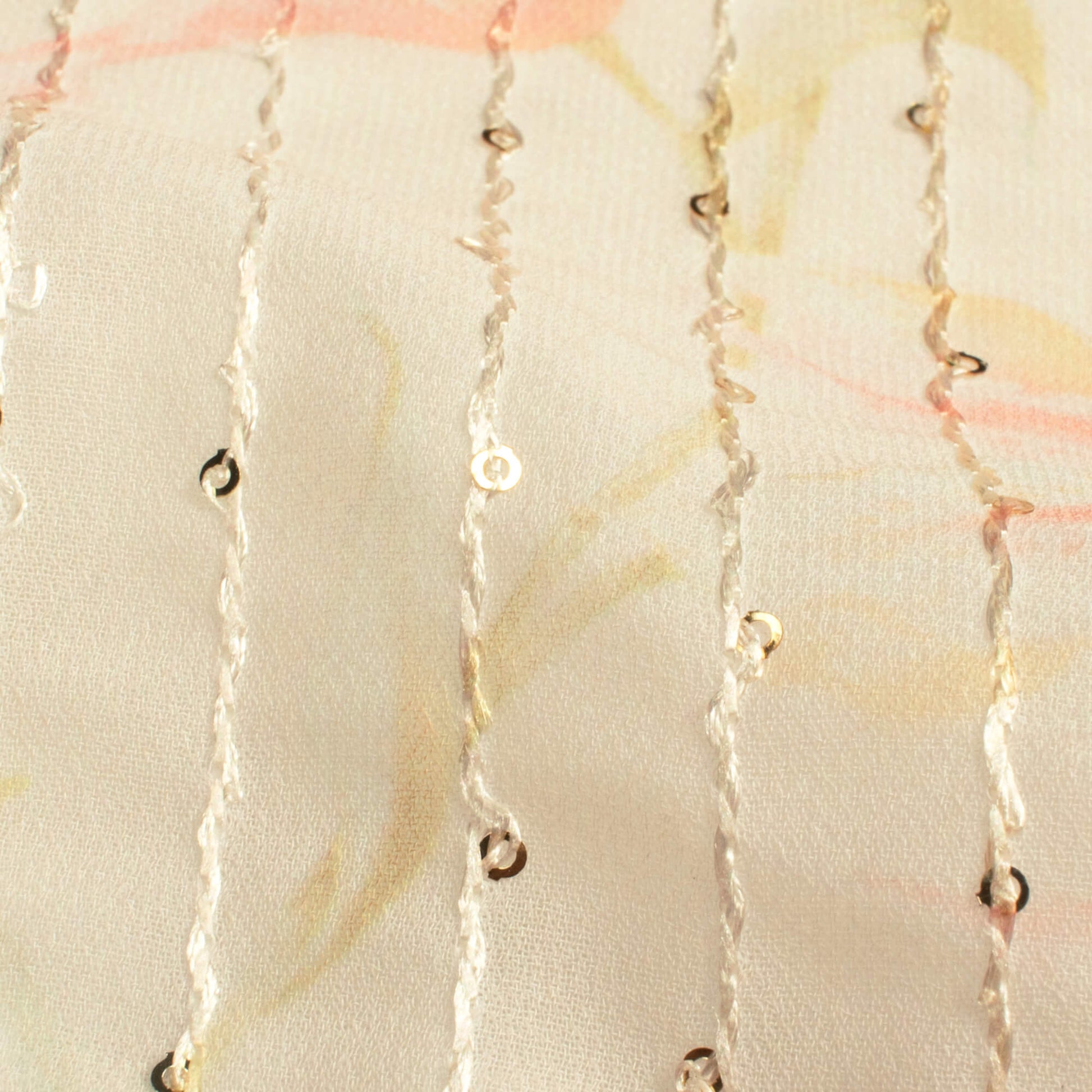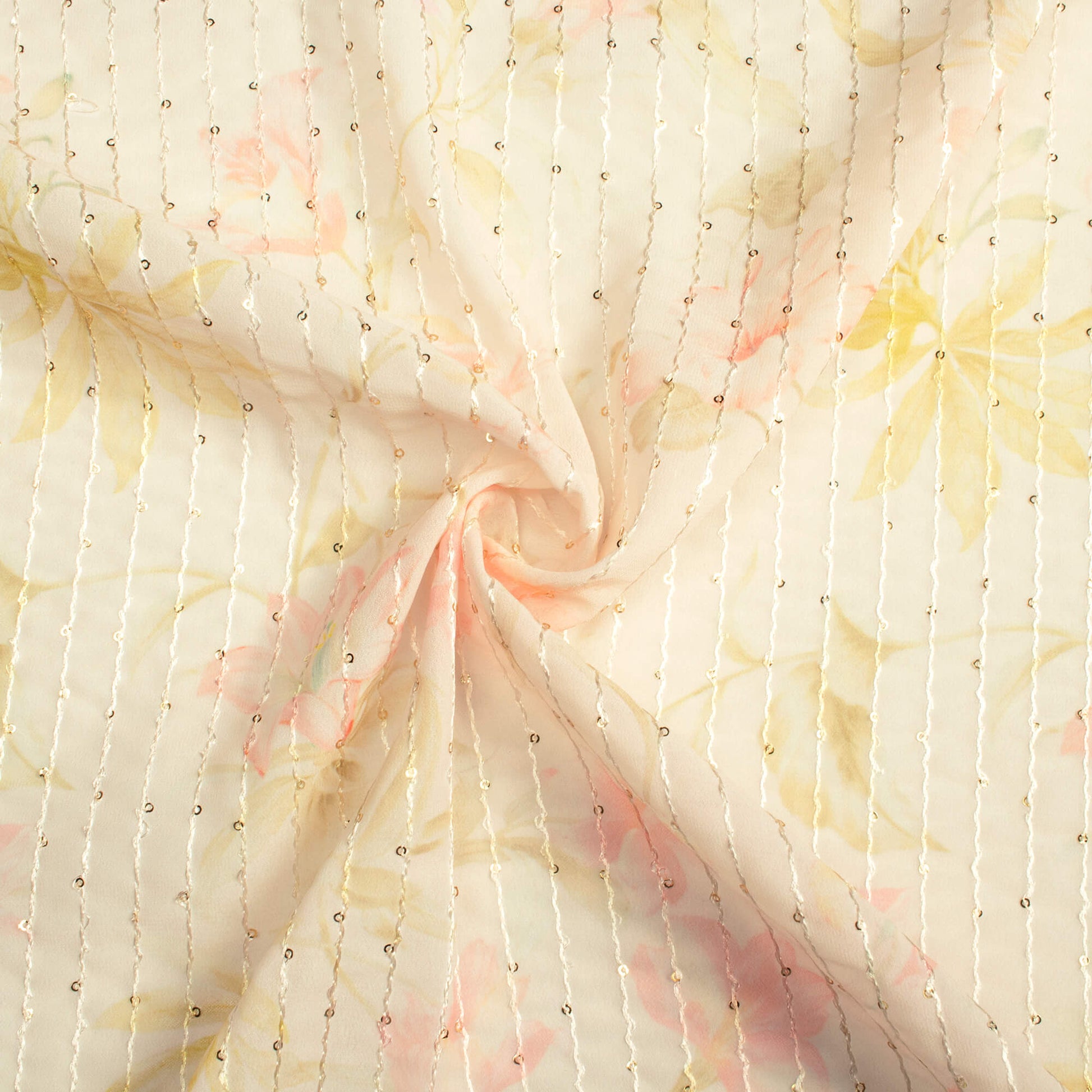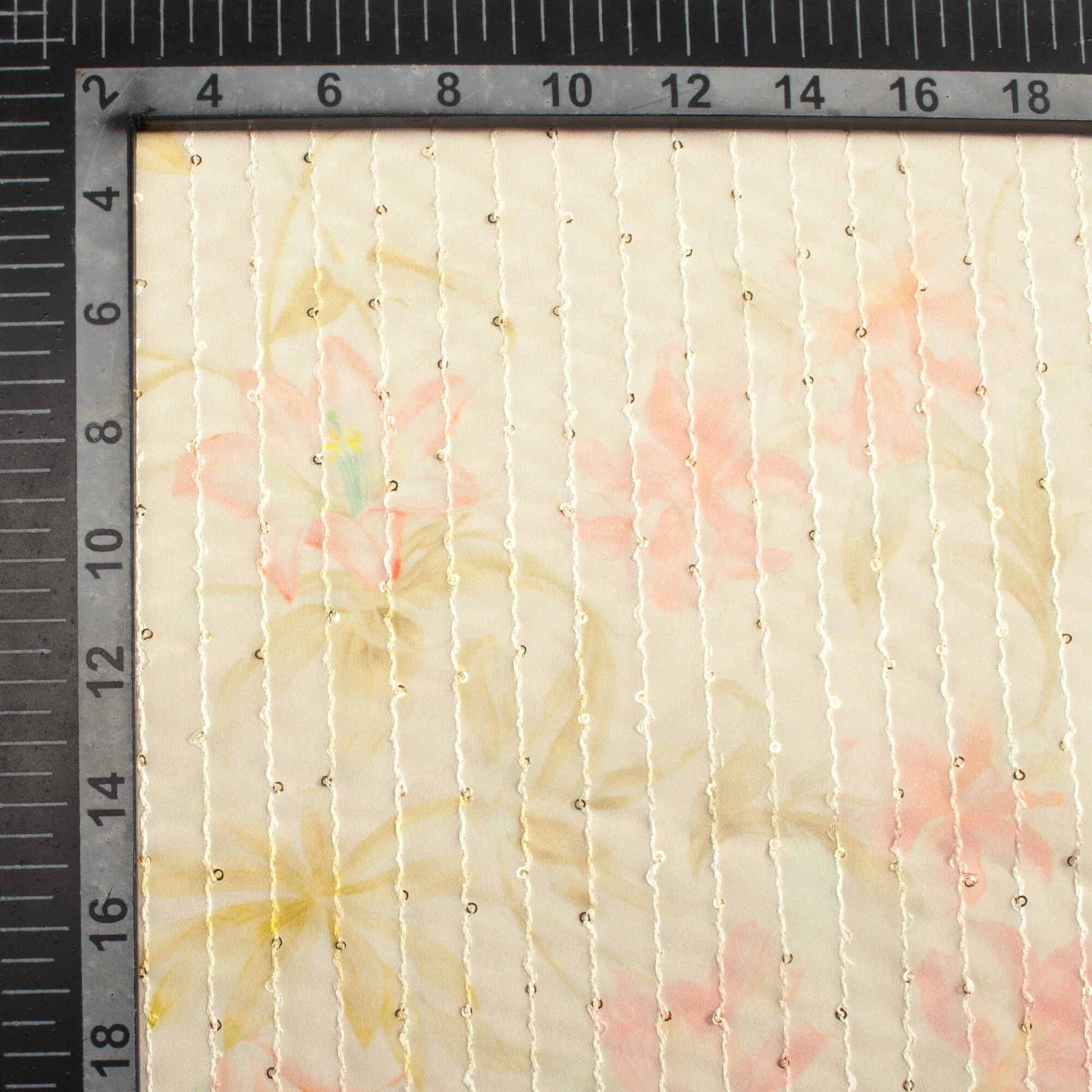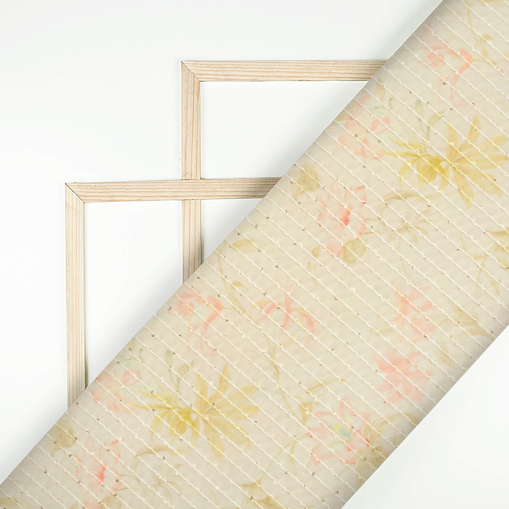 Oyster Beige And Baby Pink Floral Pattern Digital Print Premium Sequins Georgette Fabric