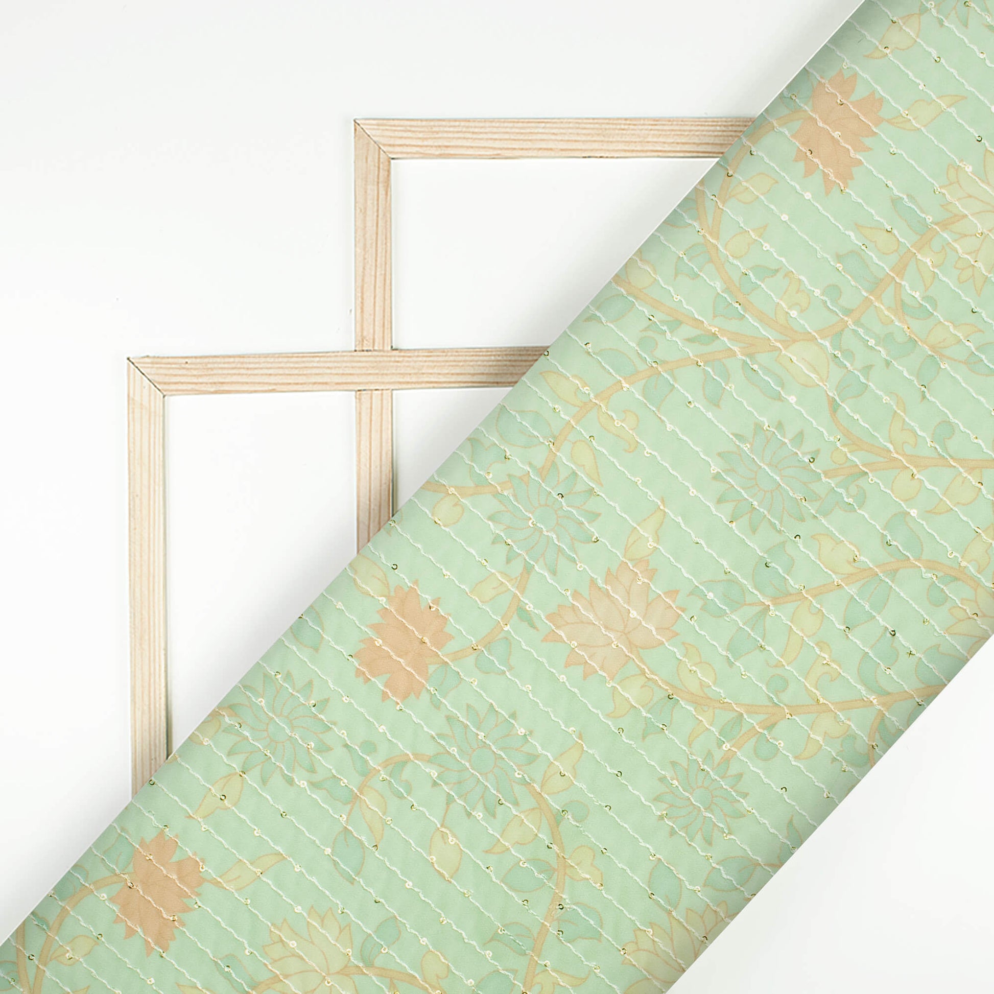 Pale Green And Blush Red Floral Pattern Digital Print Premium Sequins Georgette Fabric
