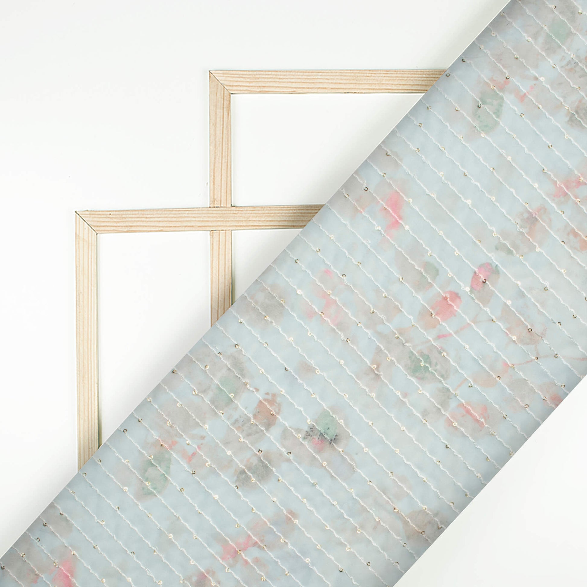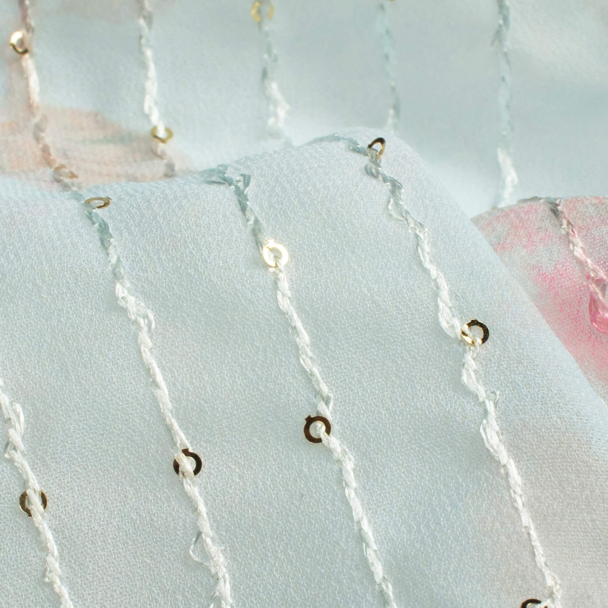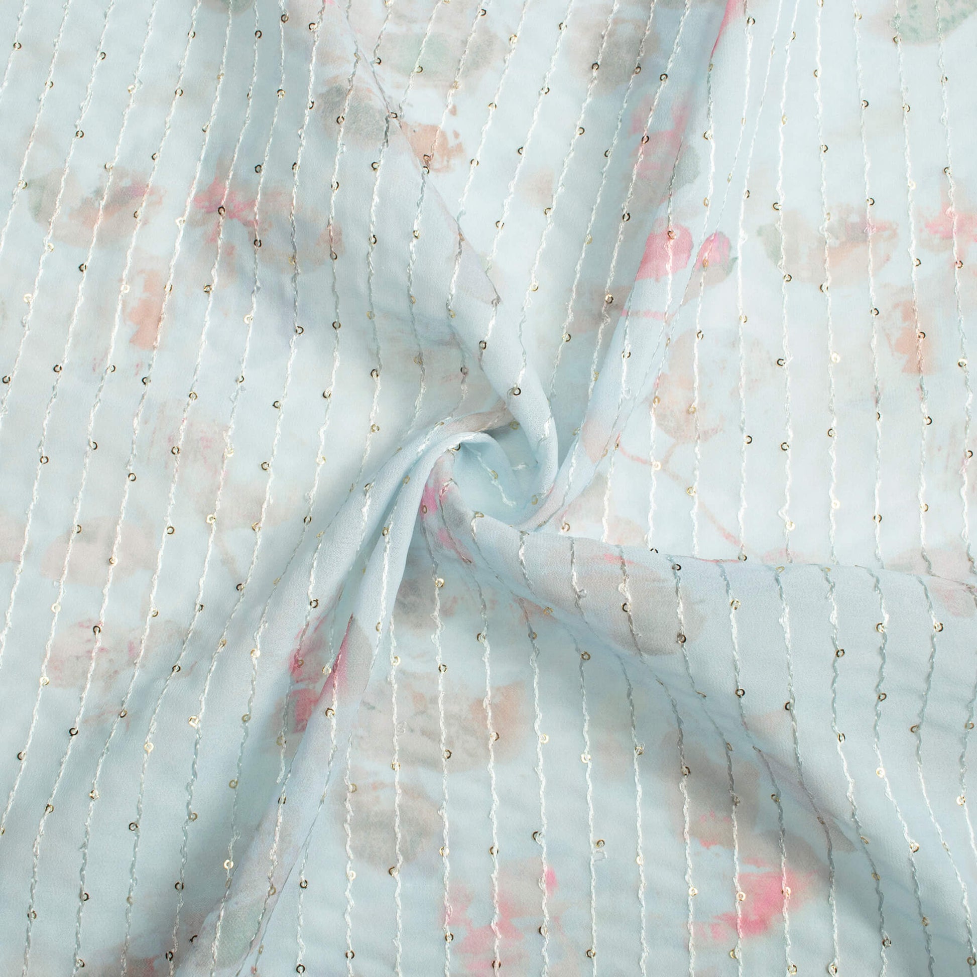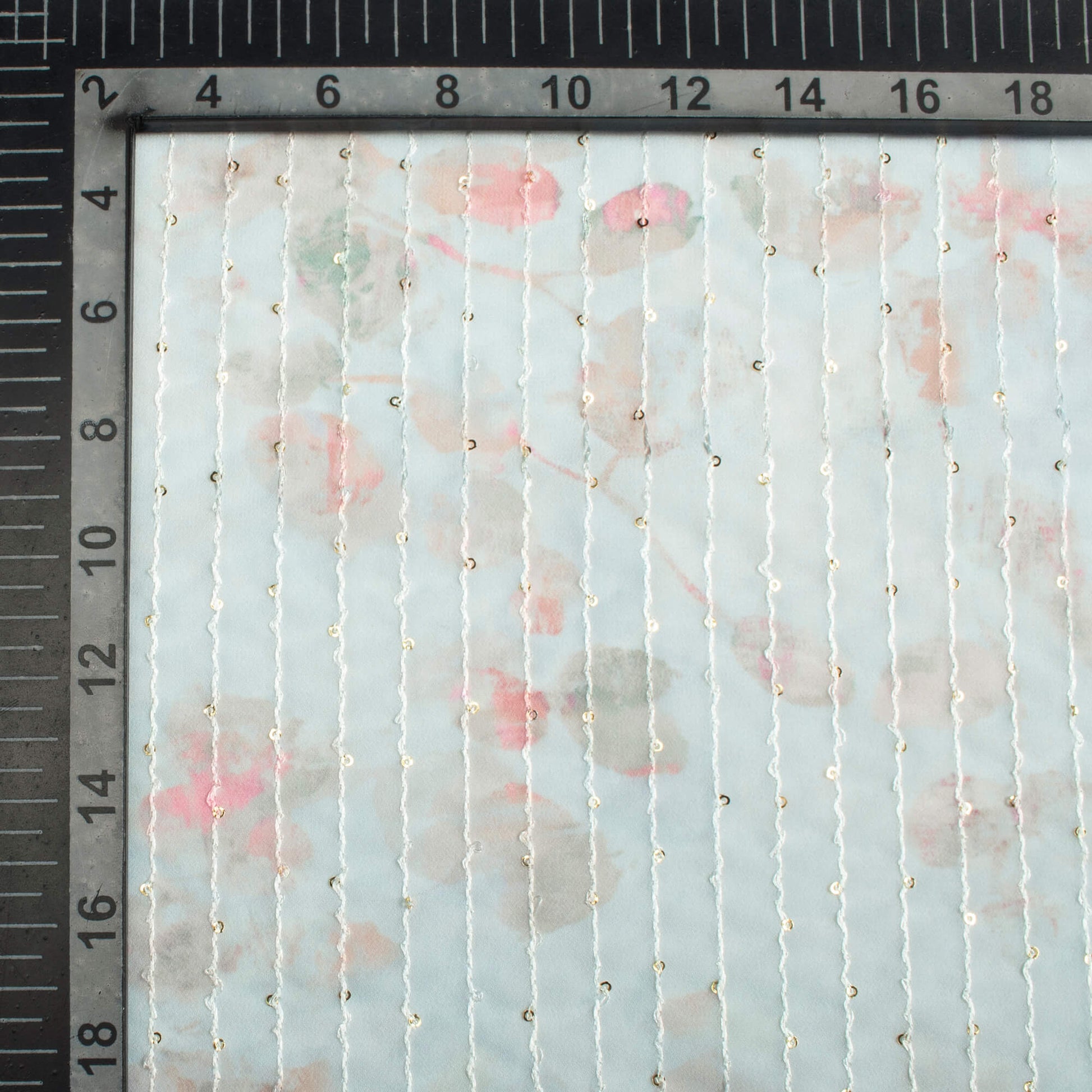 Pale Sky Blue And Pink Leaf Pattern Digital Print Premium Sequins Georgette Fabric