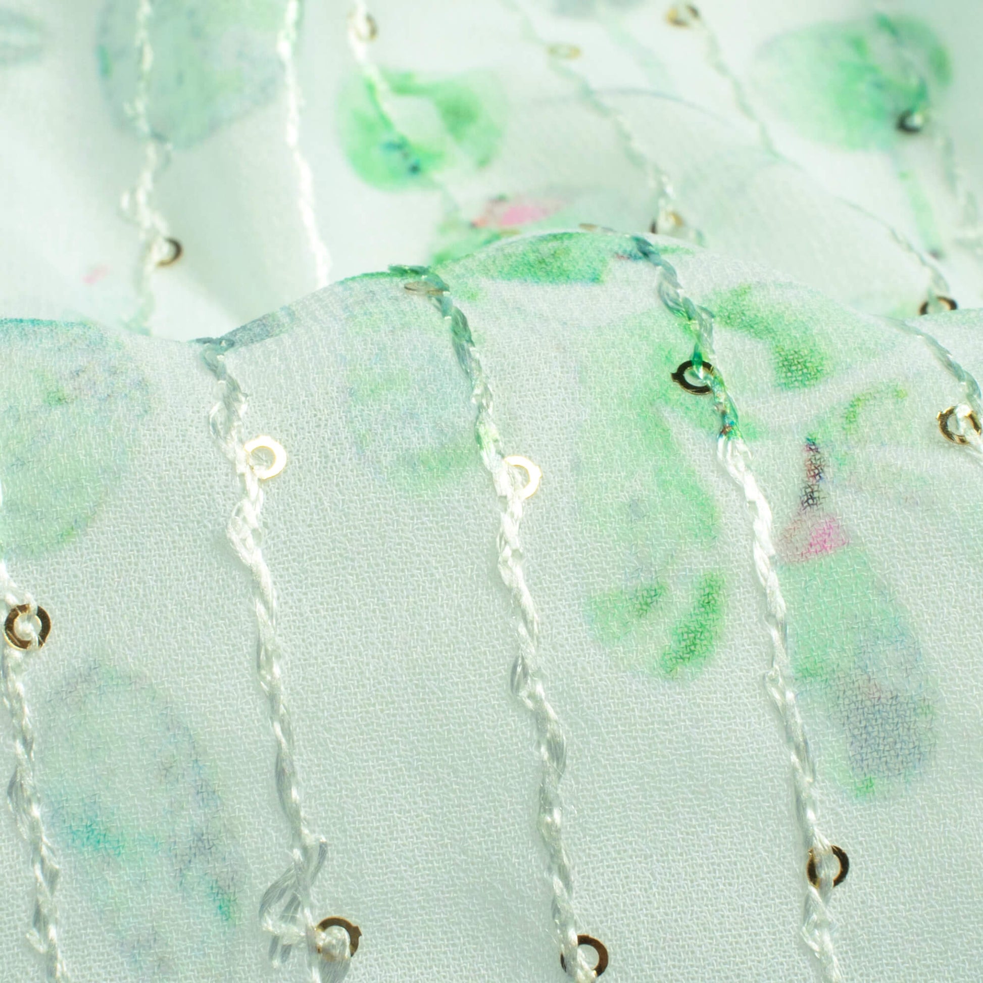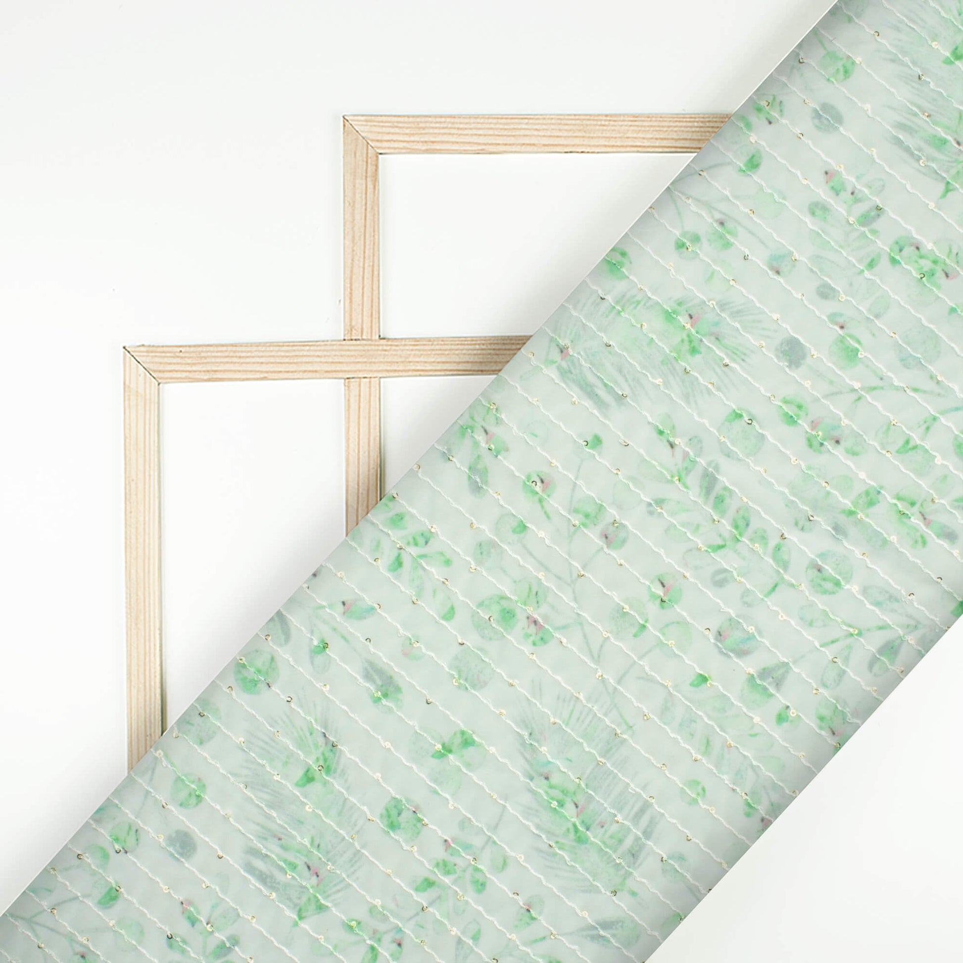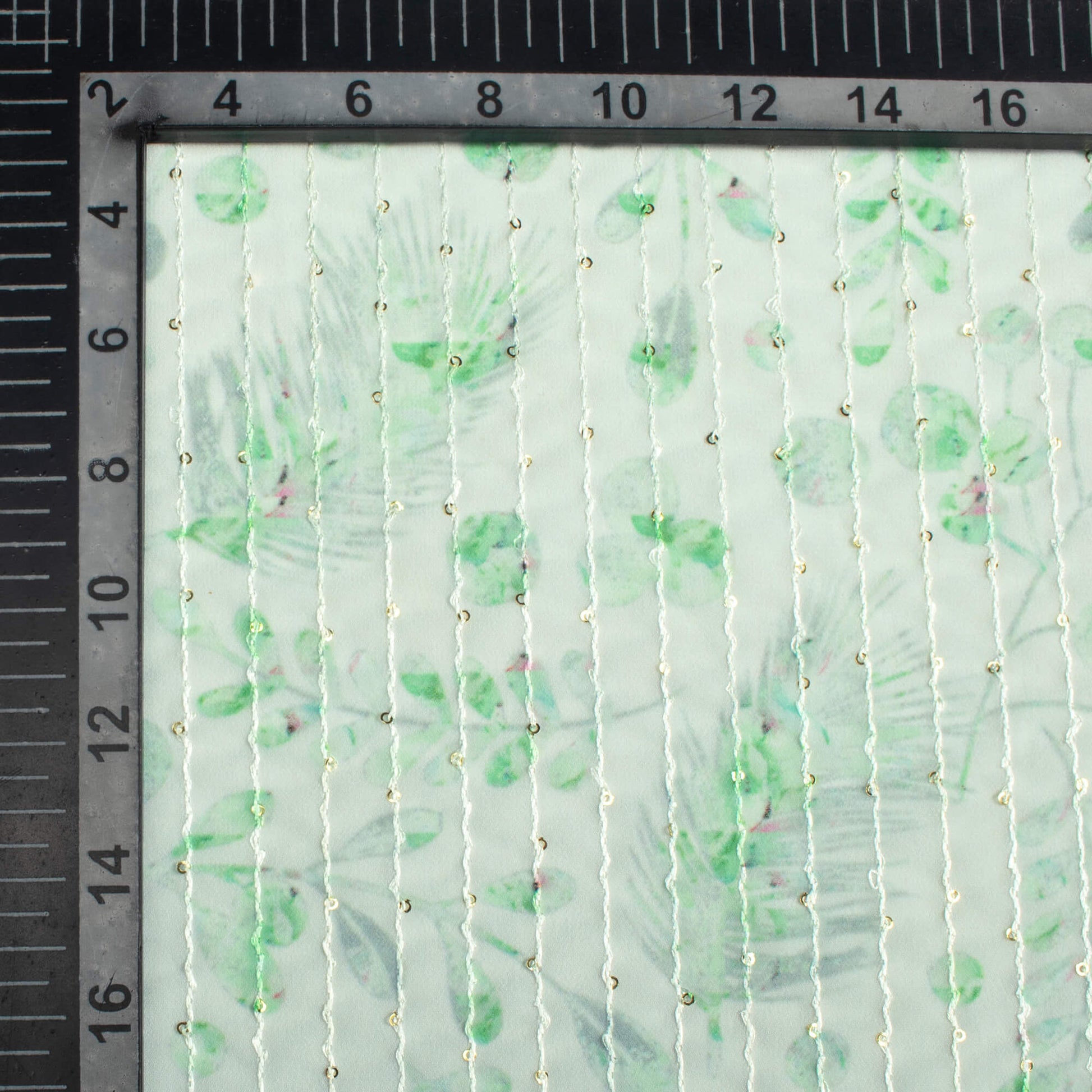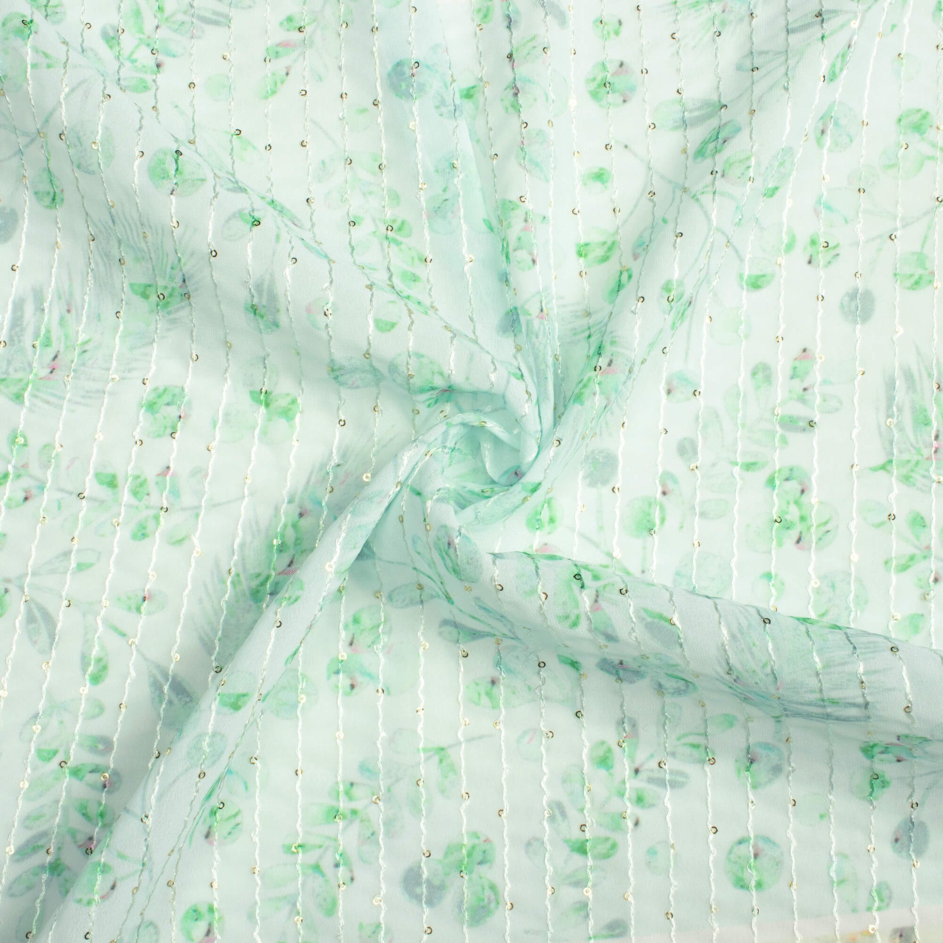 Pastel Green Leaf Pattern Digital Print Premium Sequins Georgette Fabric