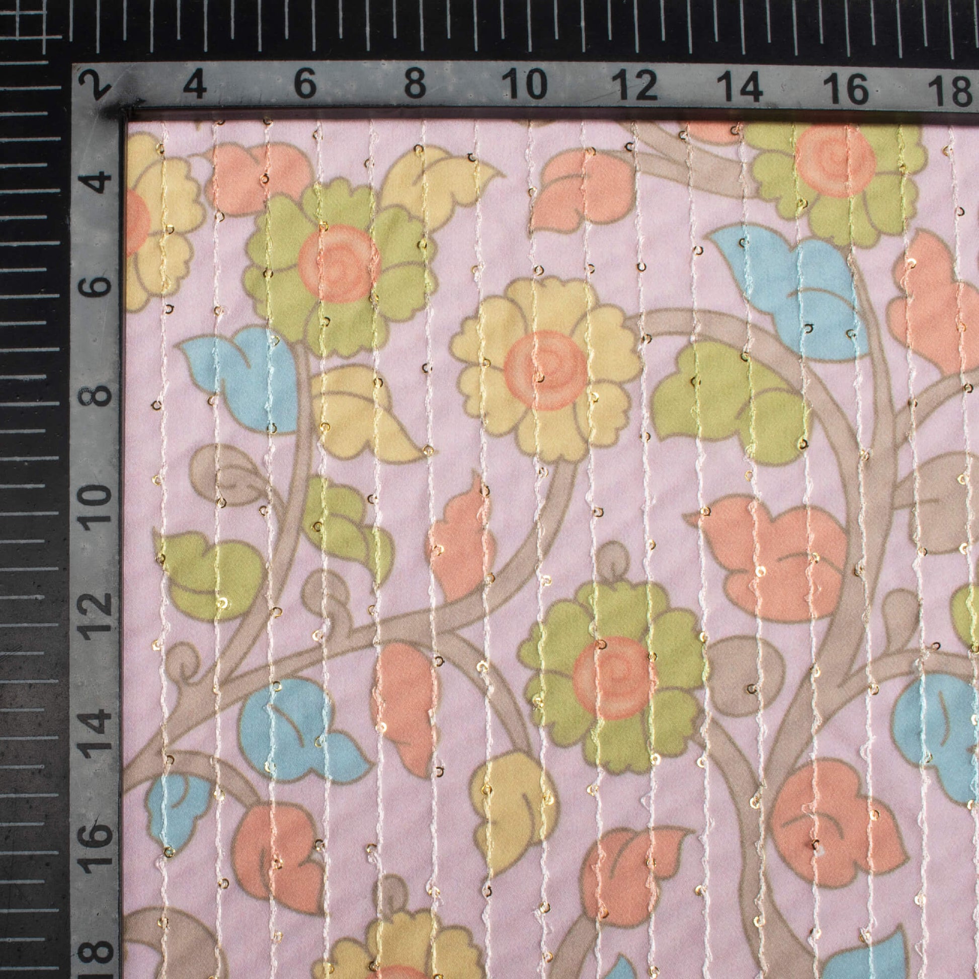 Pastel Pink And Moss Green Kalamkrii Pattern Digital Print Premium Sequins Georgette Fabric