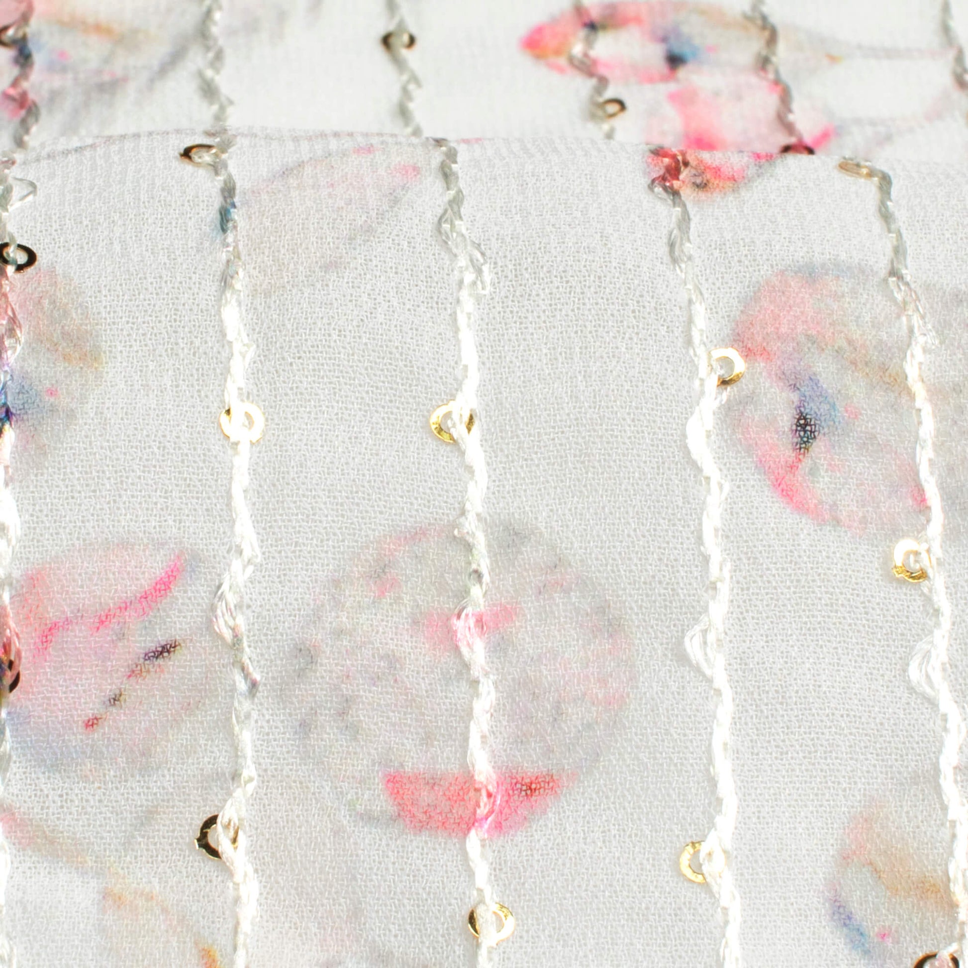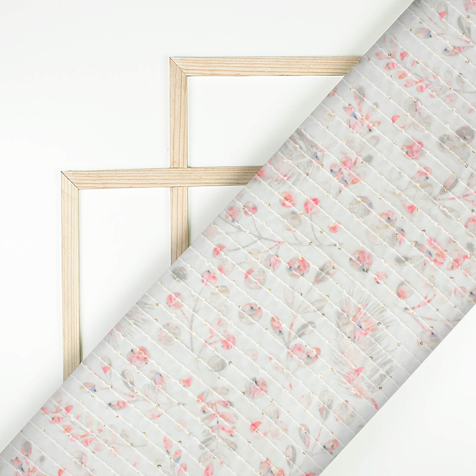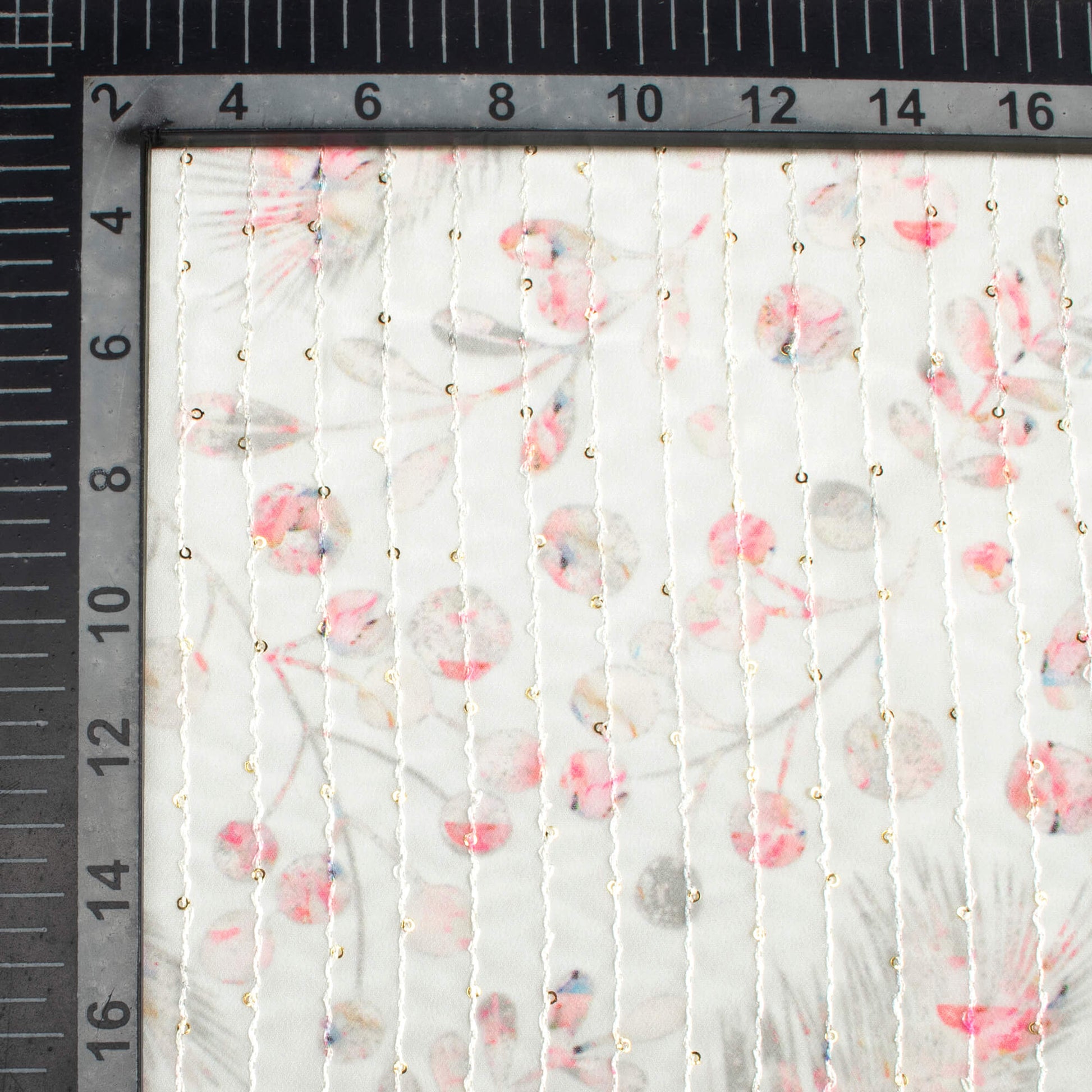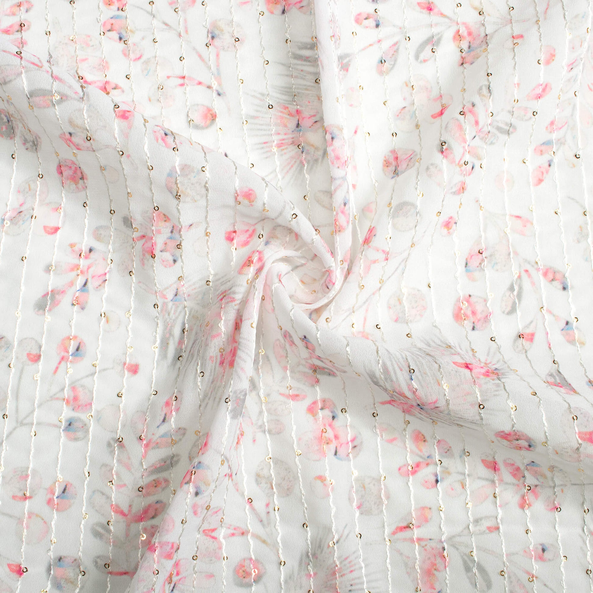 Premium White And Pink Leaf Pattern Digital Print Premium Sequins Georgette Fabric