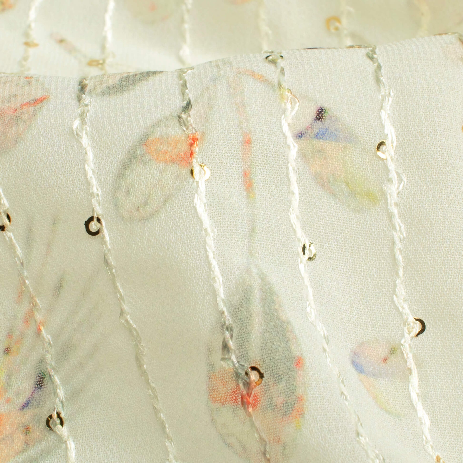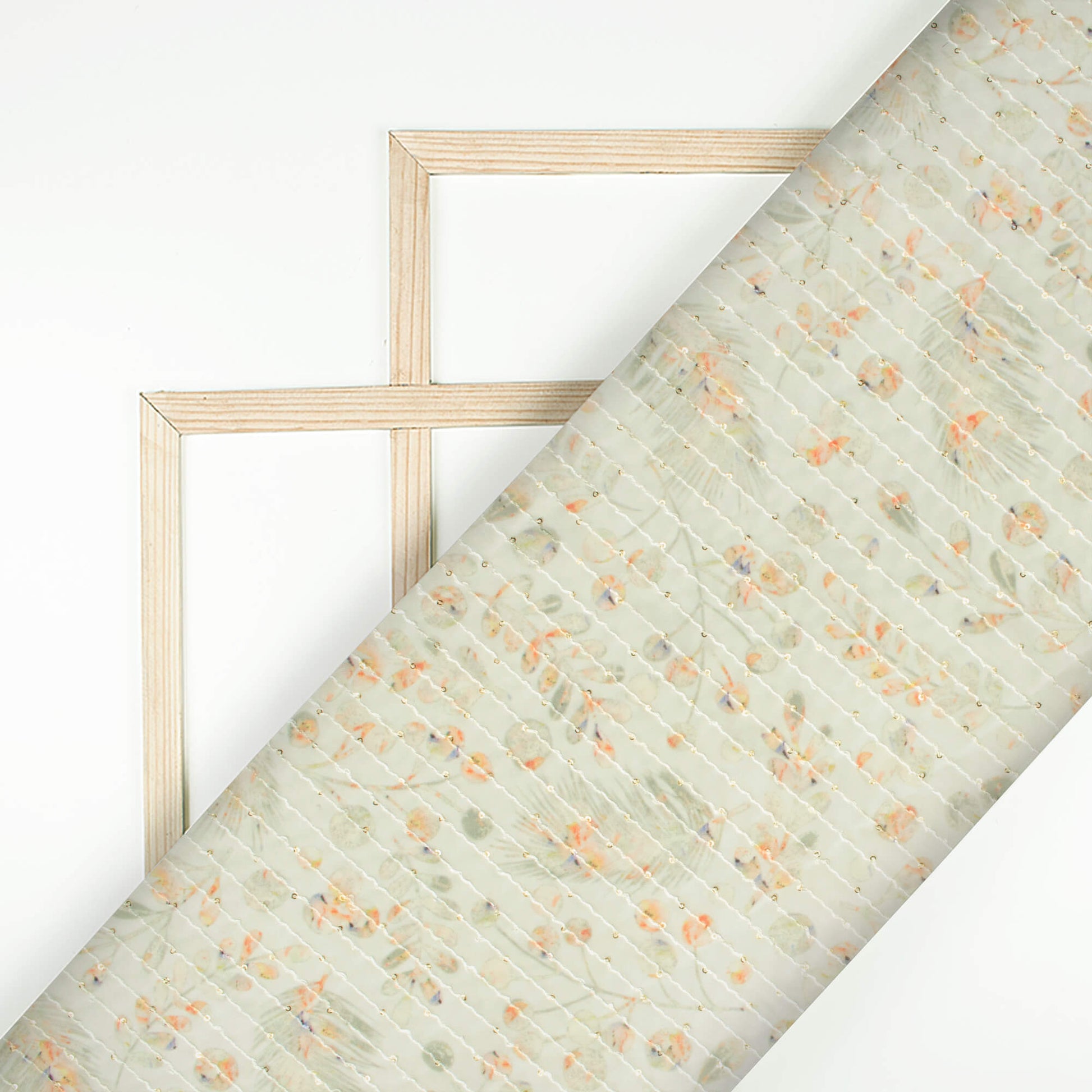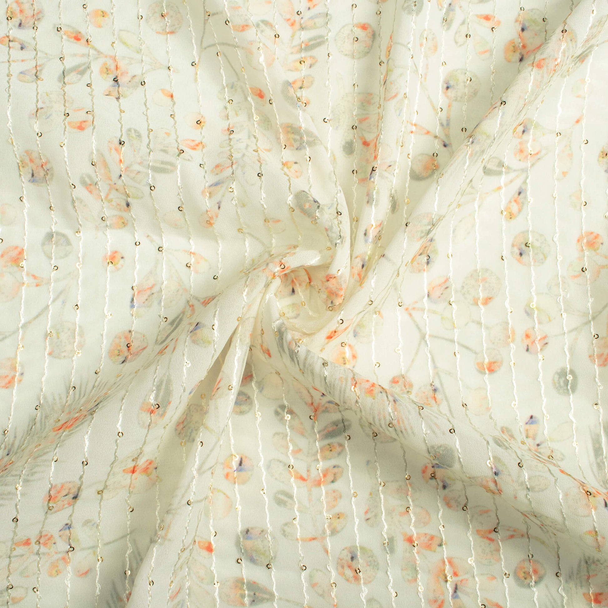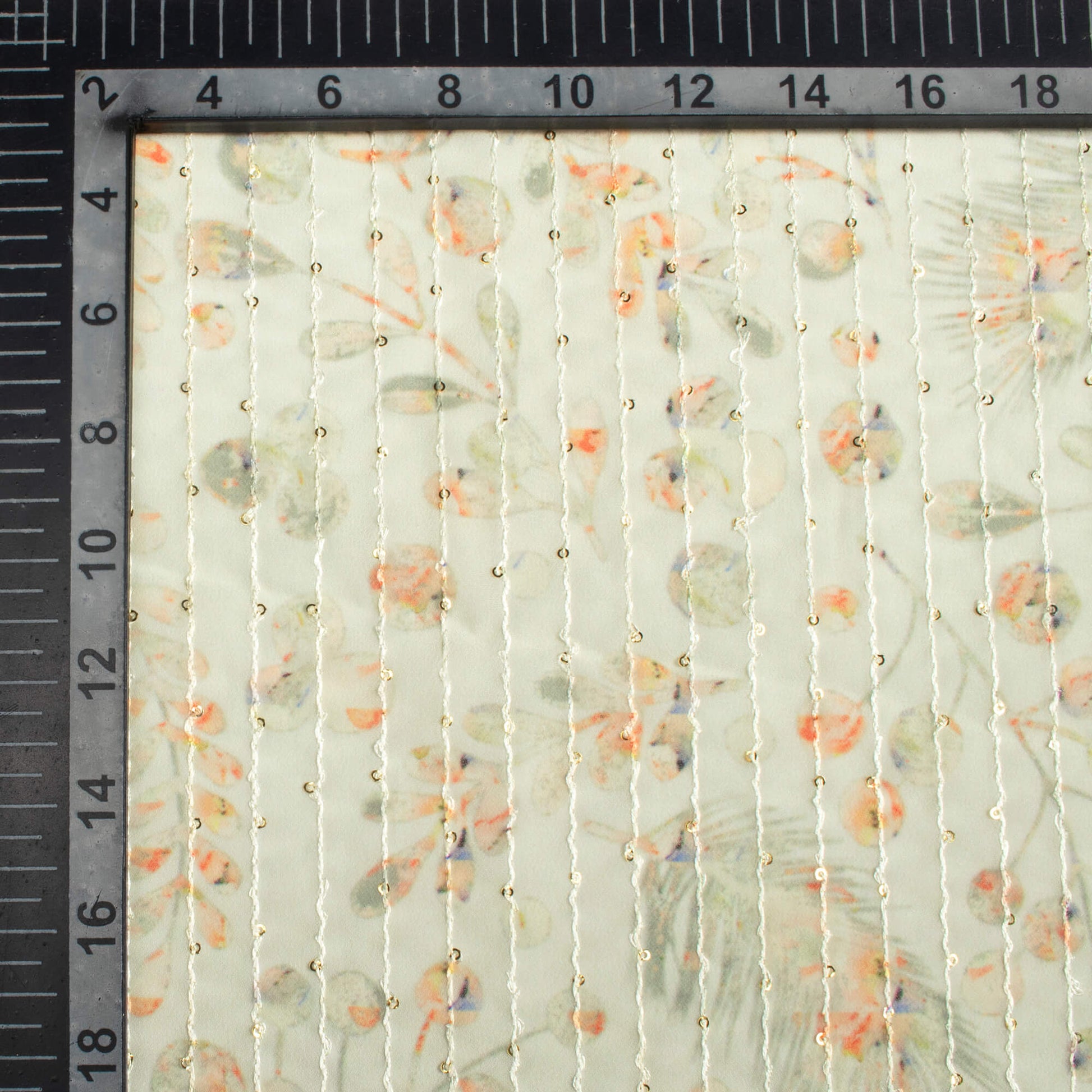 Tea Green And Orange Leaf Pattern Digital Print Premium Sequins Georgette Fabric