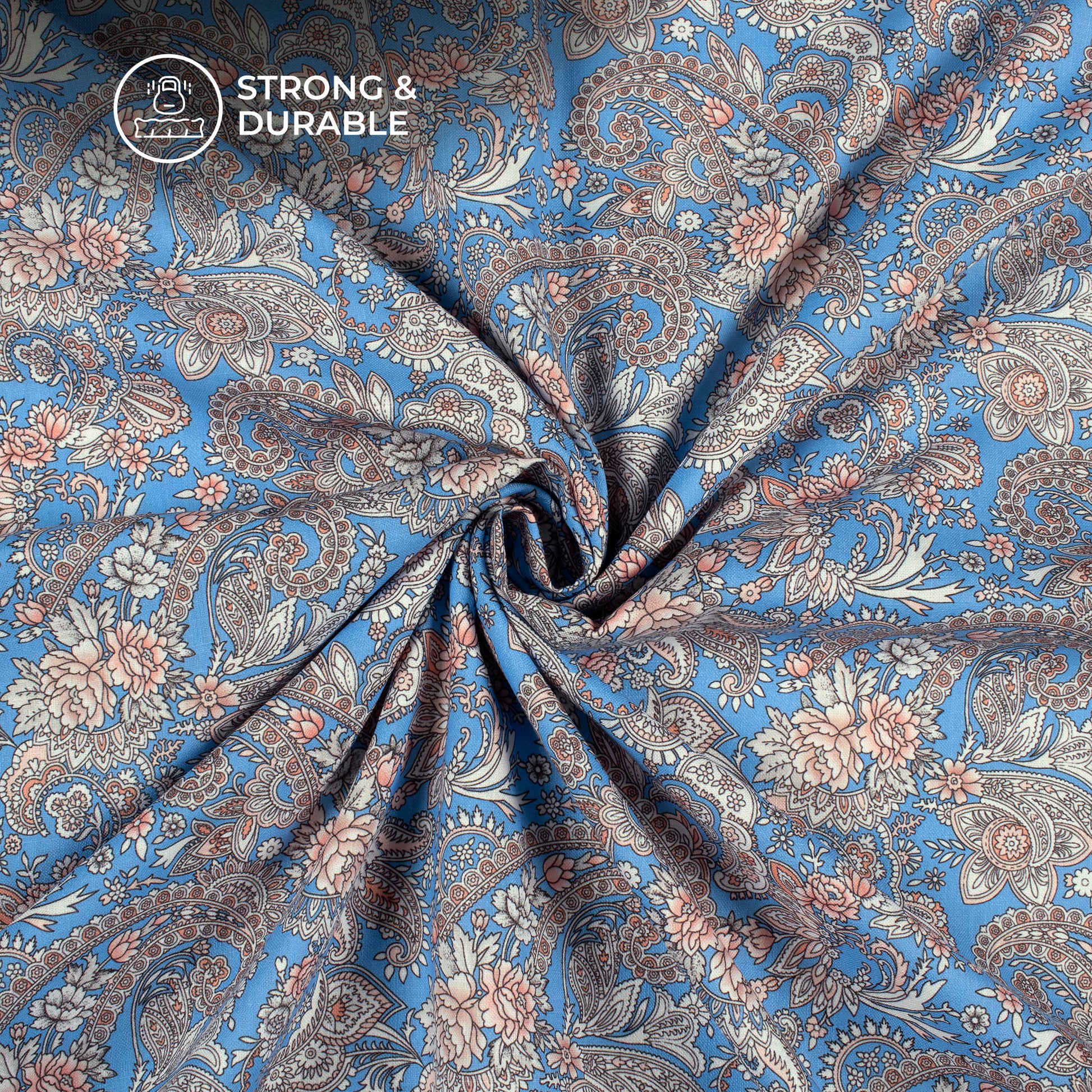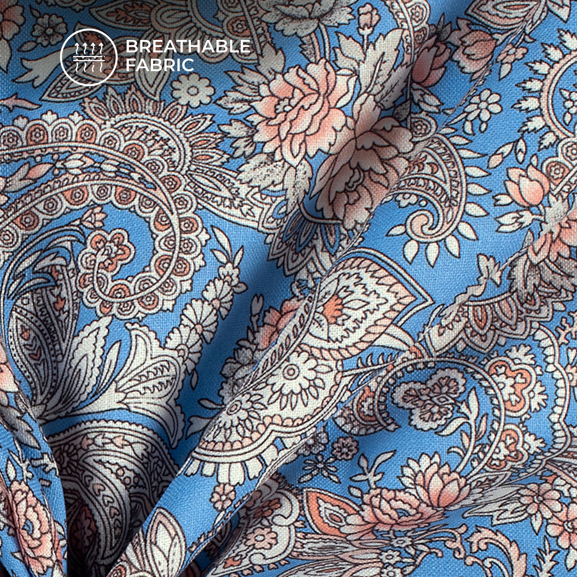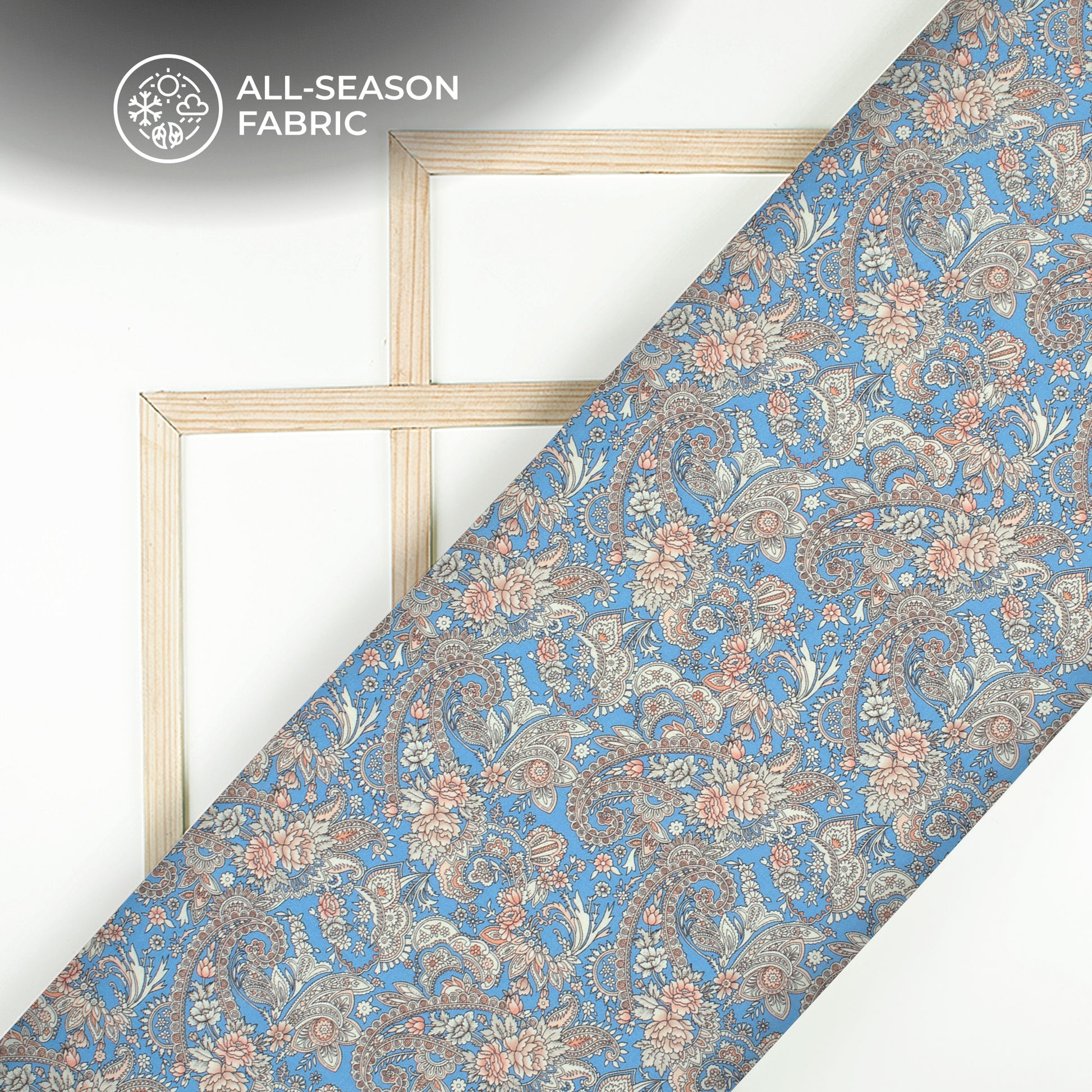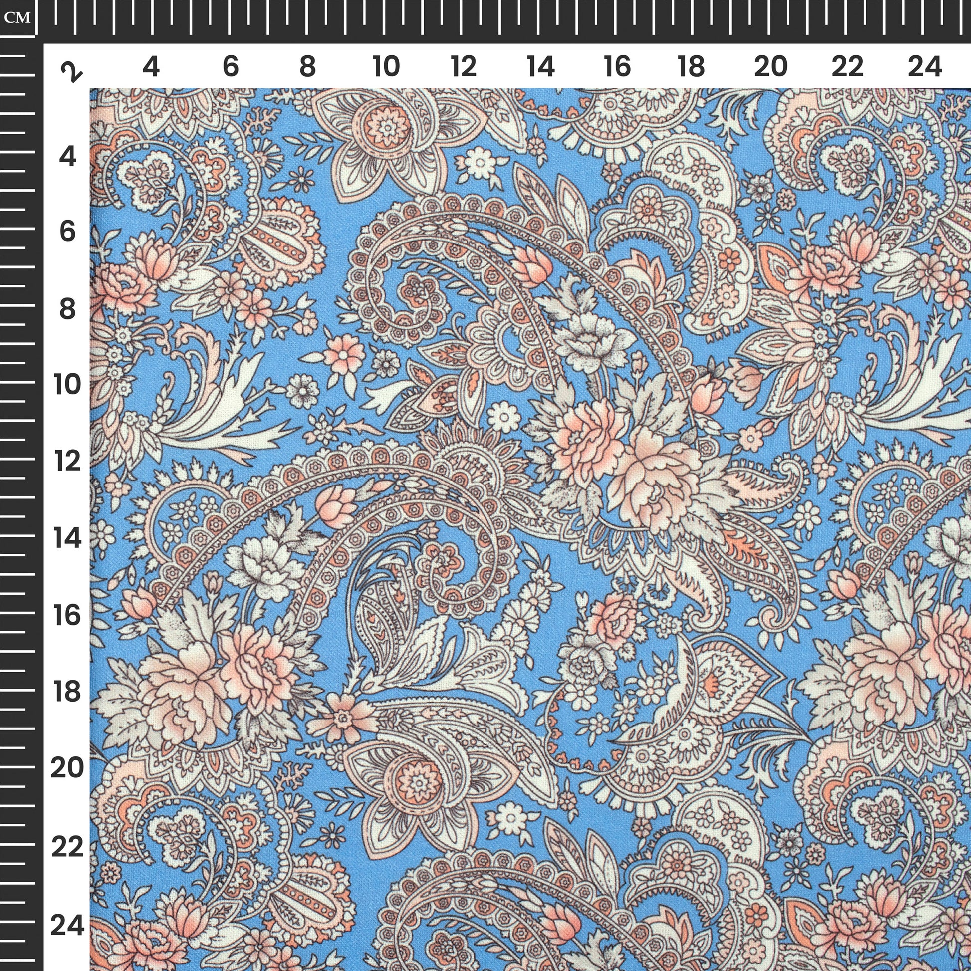 Baby Blue Floral Digital Print Linen Textured Fabric (Width 56 Inches)