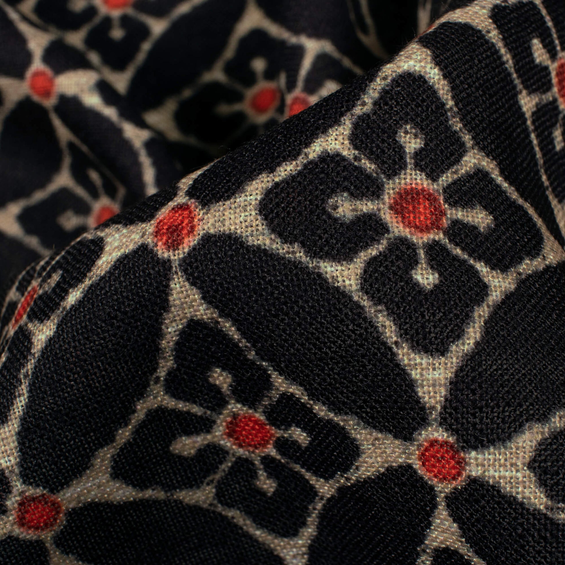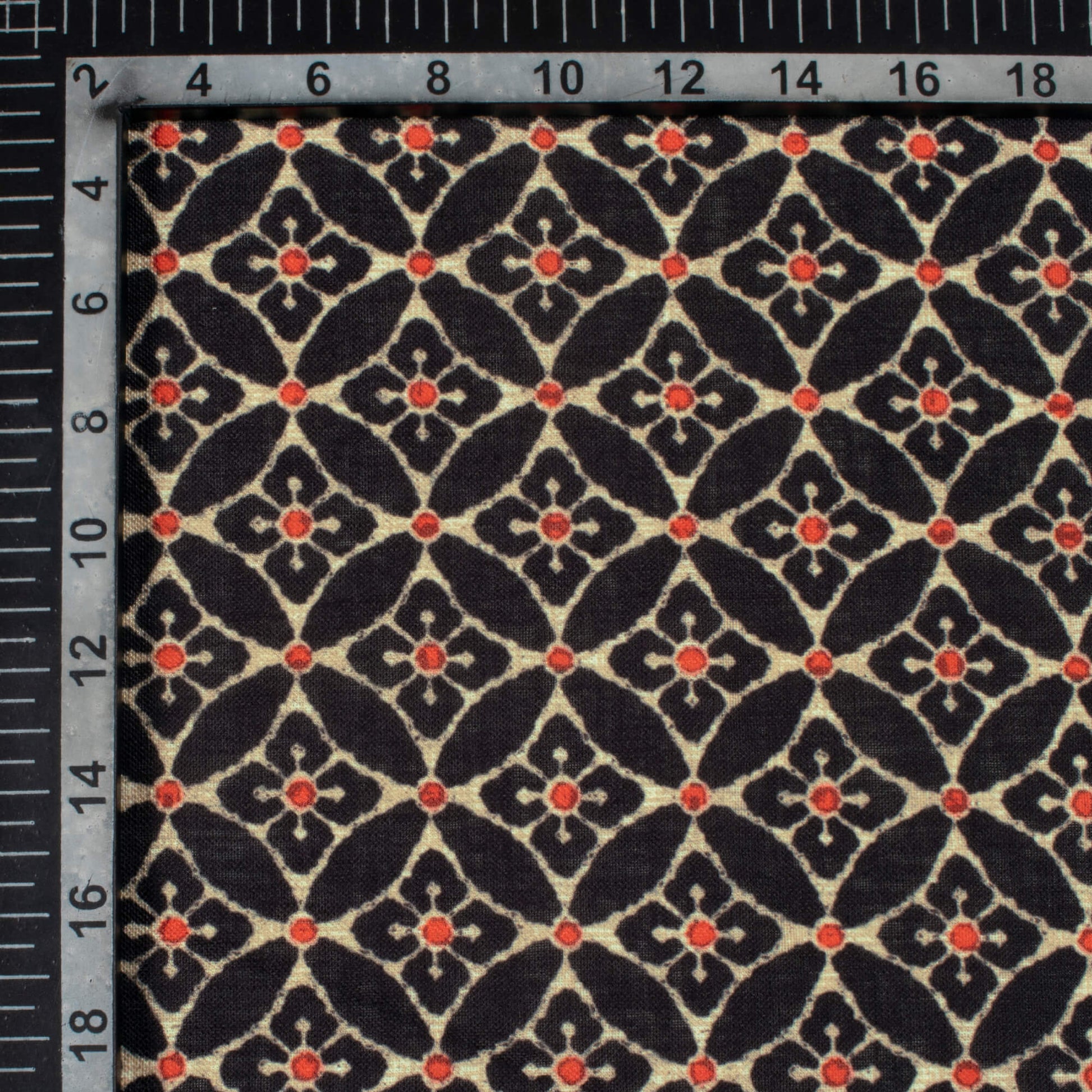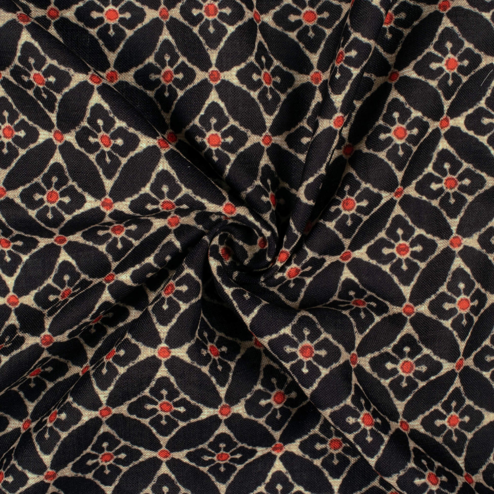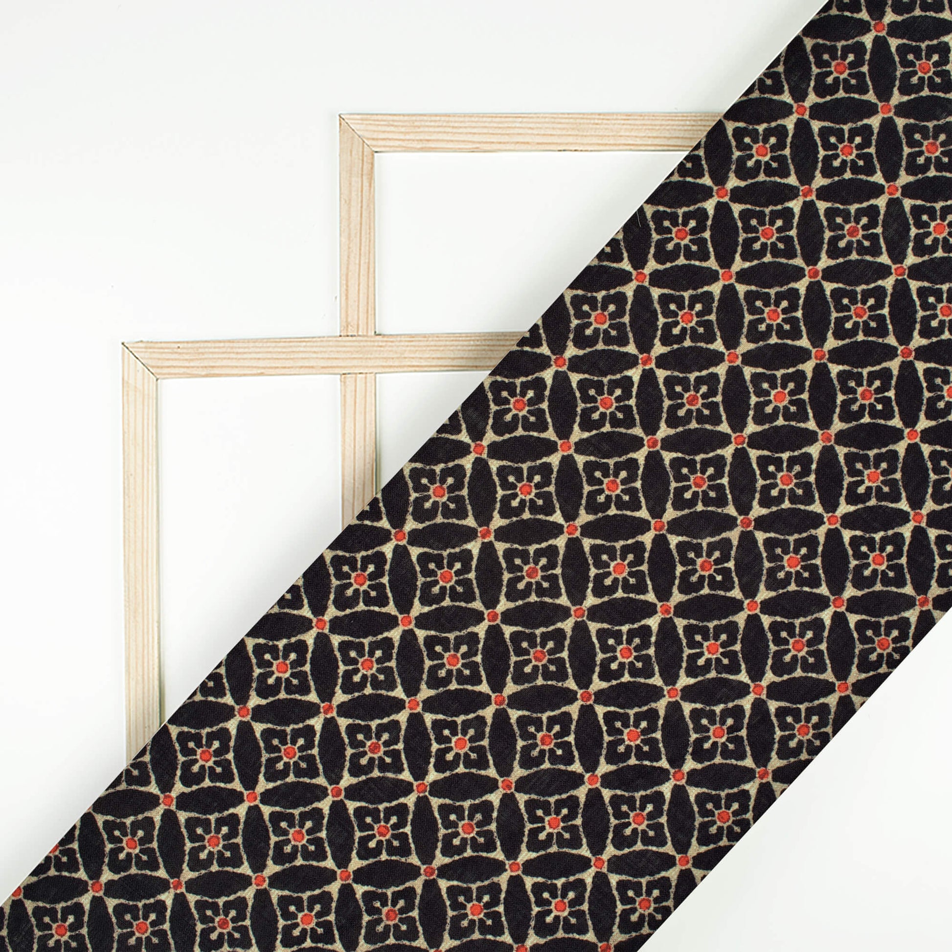 Black And Beige Traditional Pattern Digital Print Linen Textured Fabric (Width 56 Inches)