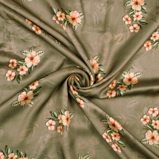 Salmon Orange And Army Green Floral Pattern Digital Print Premium Lush Satin Fabric Salmon Orange And Army Green Floral Pattern Digital Print Premium Lush Satin Fabric