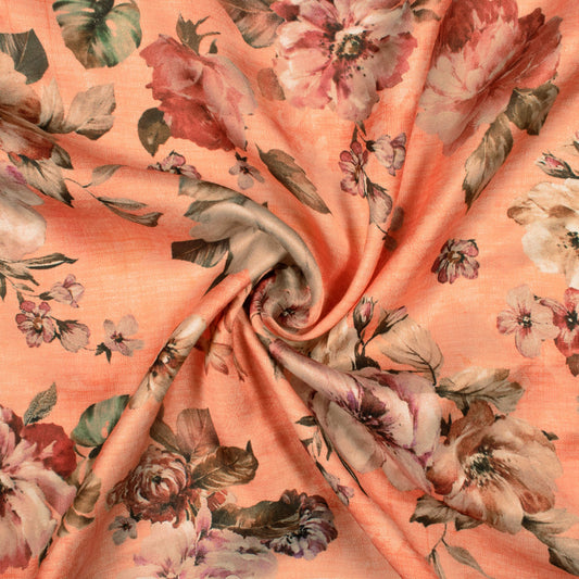 Salamander Orange And Peach Floral Pattern Digital Print Linen Textured Fabric (Width 56 Inches) Salamander Orange And Peach Floral Pattern Digital Print Linen Textured Fabric (Width 56 Inches)