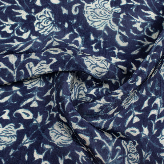 Navy Blue And Bright White Floral Pattern Digital Print Viscose Uppada Silk Fabric Navy Blue And Bright White Floral Pattern Digital Print Viscose Uppada Silk Fabric