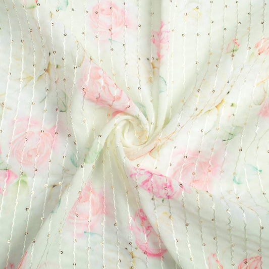 Tea Green And Carnation Pink Floral Pattern Digital Print Premium Sequins Georgette Fabric Tea Green And Carnation Pink Floral Pattern Digital Print Premium Sequins Georgette Fabric