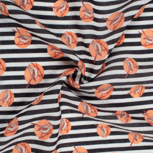 Black And Peach Bird Pattern Digital Print Viscose Chanderi Fabric Black And Peach Bird Pattern Digital Print Viscose Chanderi Fabric