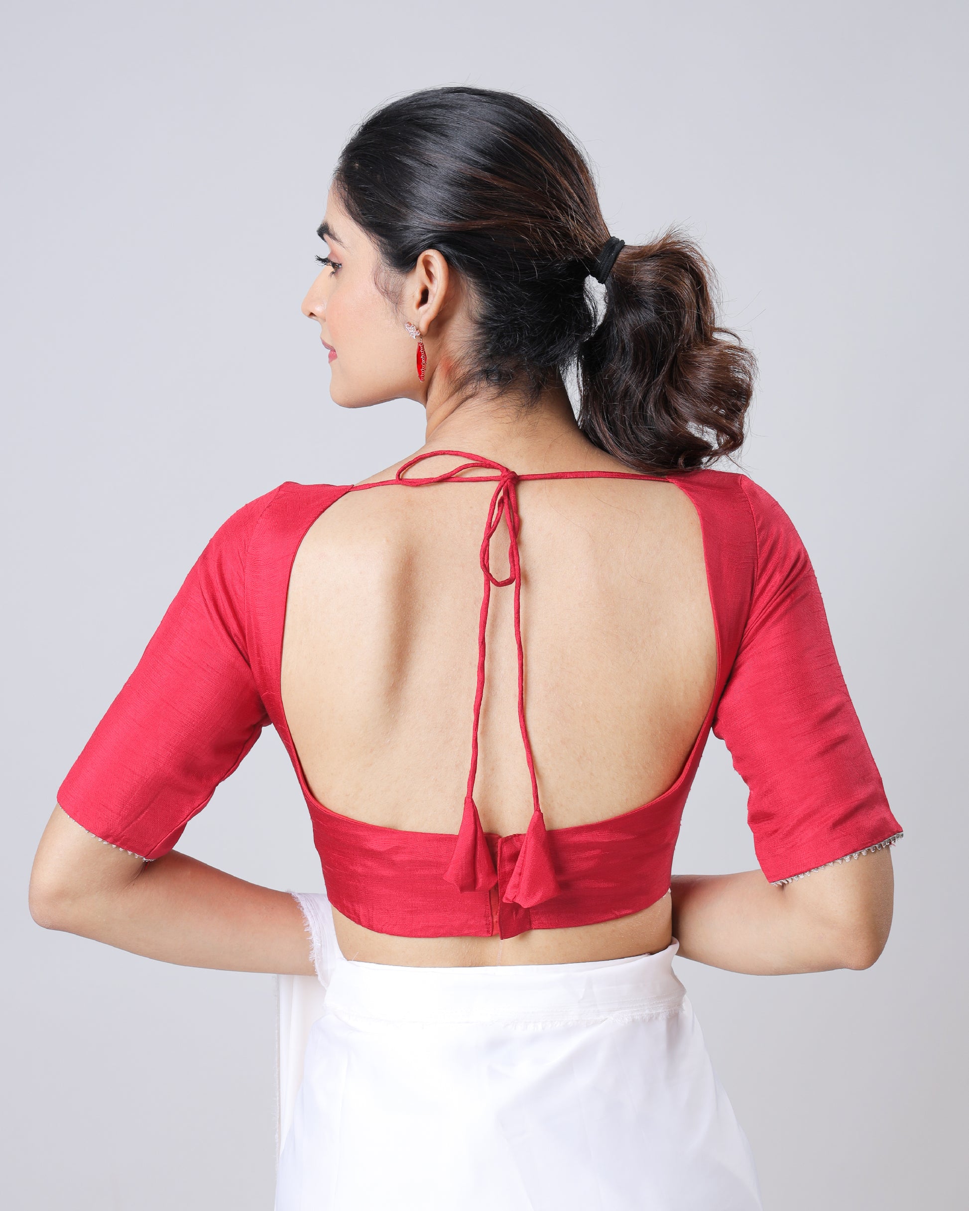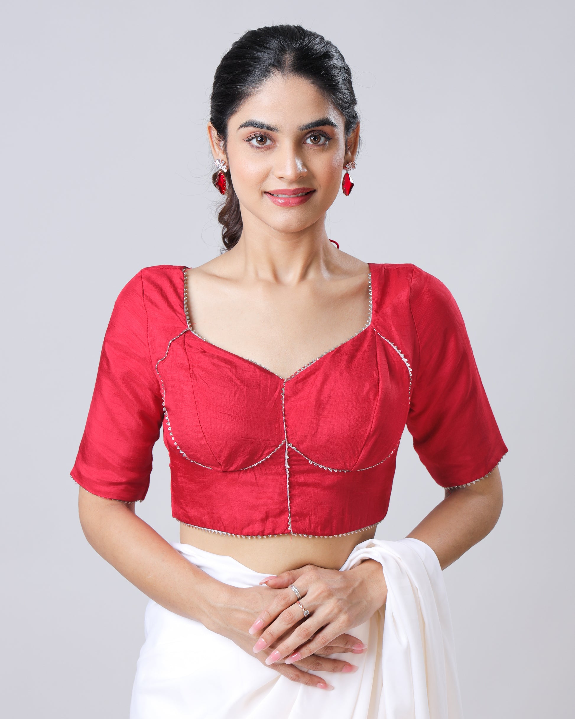 Elevate your ethnic wardrobe with this exquisite Viscose Dola Silk blouse. Featuring a flattering sweetheart neckline, delicate lace work, and a luxurious finish, this blouse adds a touch of rich elegance to any ensemble.