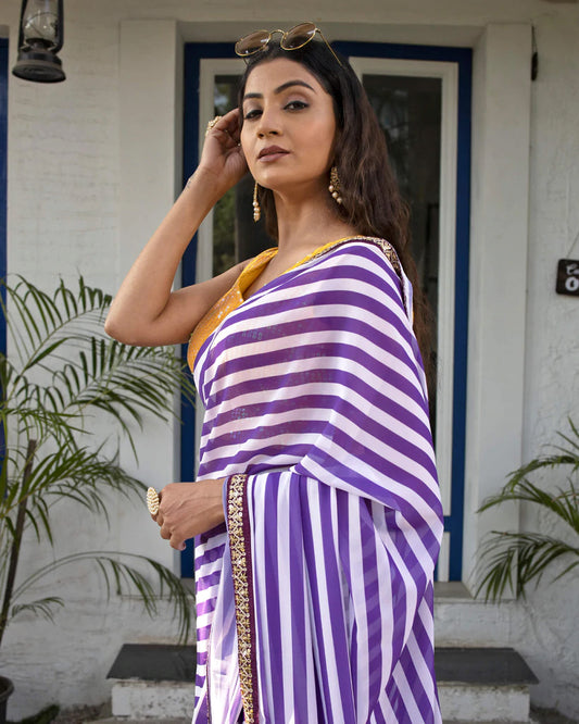 Grape Purple And White Stripes Pattern Digital Print Georgette Saree With Zari Sequins Lace Border Grape Purple And White Stripes Pattern Digital Print Georgette Saree With Zari Sequins Lace Border