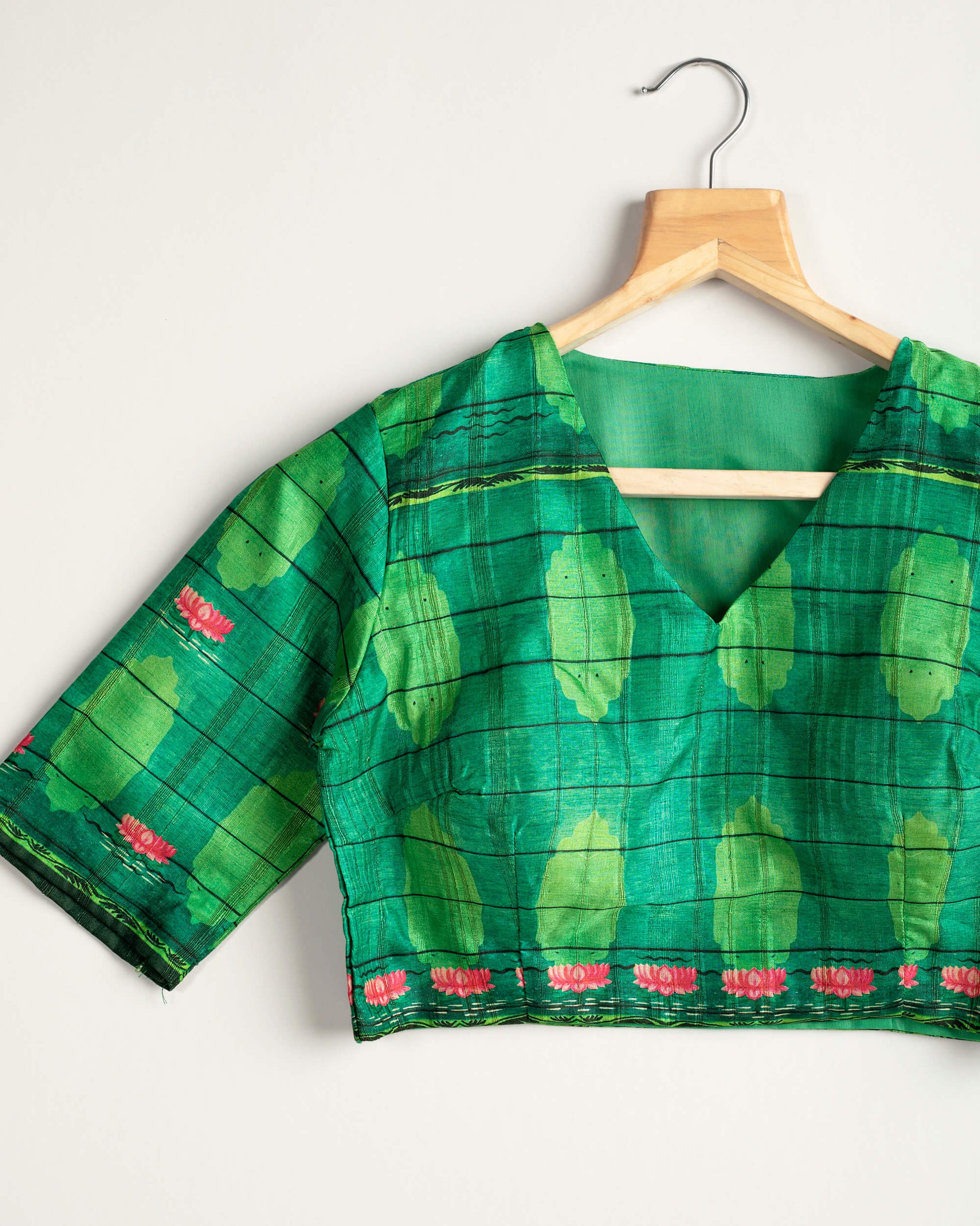 Heritage Art Silk Blouse looks sumptuous and has a fine pattern formed on it. It features a side zip, half sleeve and has a V neckline. This fabric is soft, luxrious and gives you a royal feeling. Match it with your favorite saree and this blouse won't disappoint you.