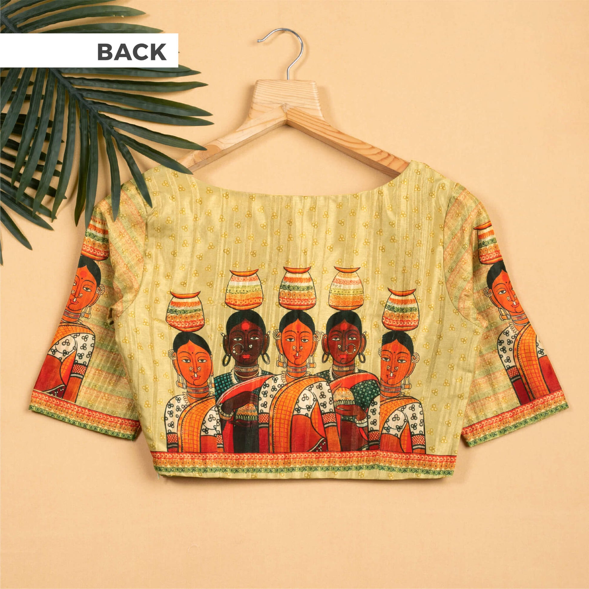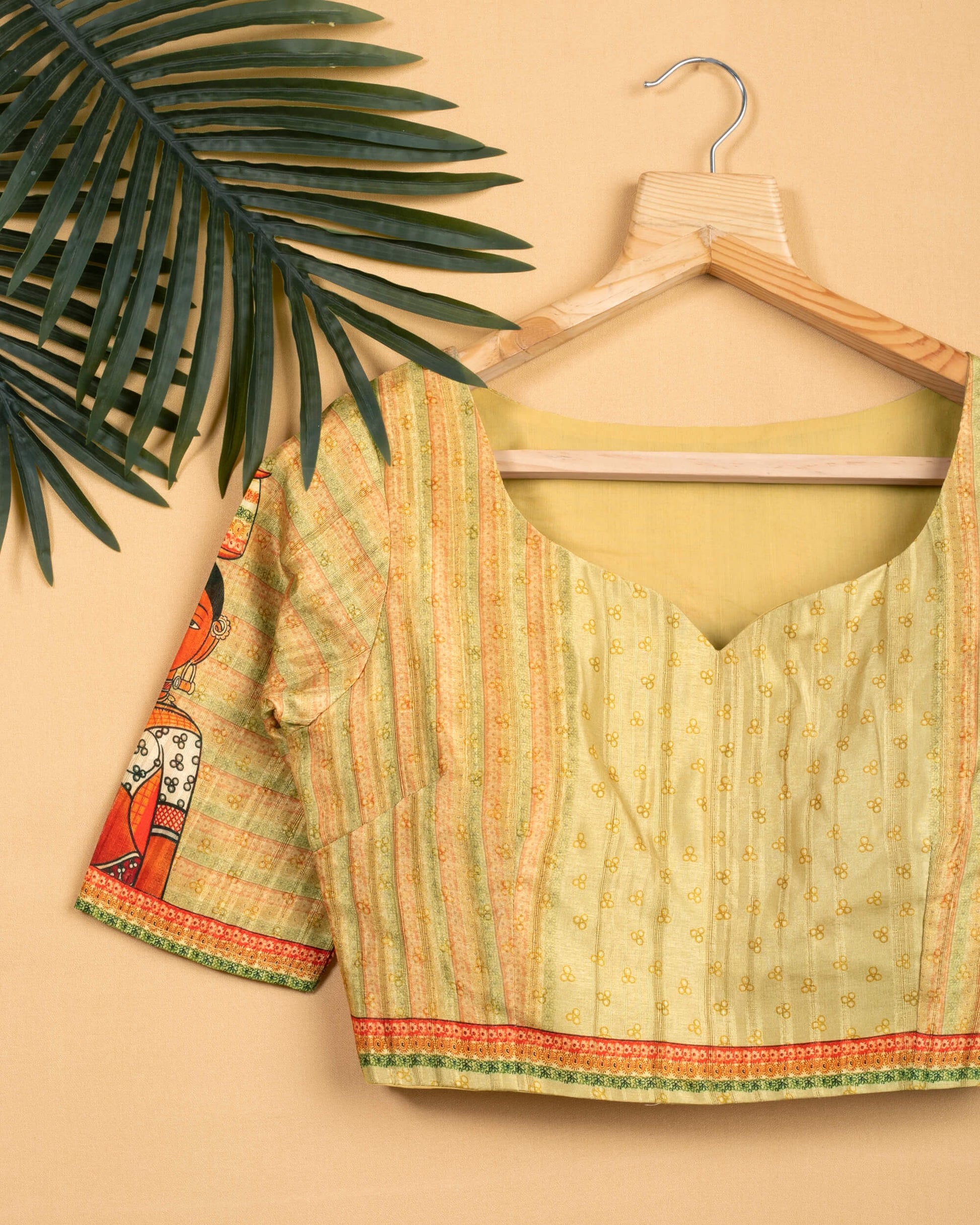 Heritage Art Silk Blouse looks sumptuous and has a fine pattern formed on it. It features a size zip, half sleeve and has a sweet heart neckline. This fabric is soft, luxrious and gives you a royal feeling. Match it with your favorite saree and this blouse won't disappoint you.