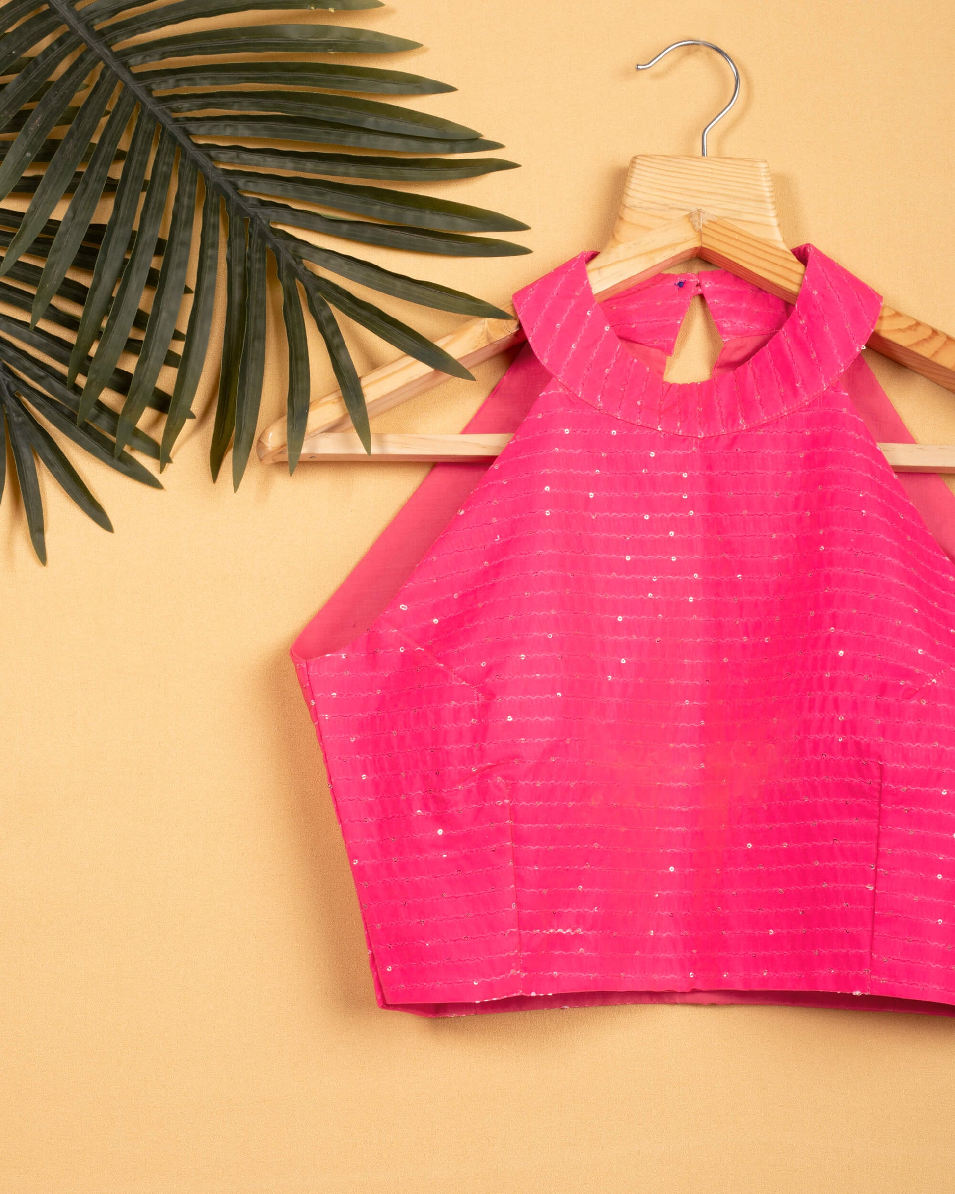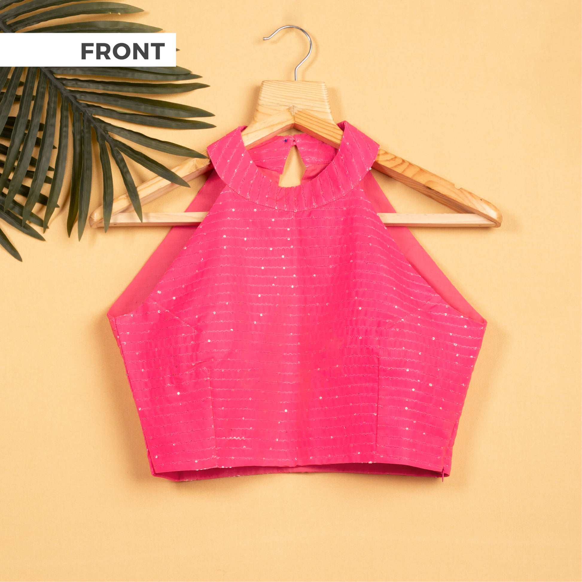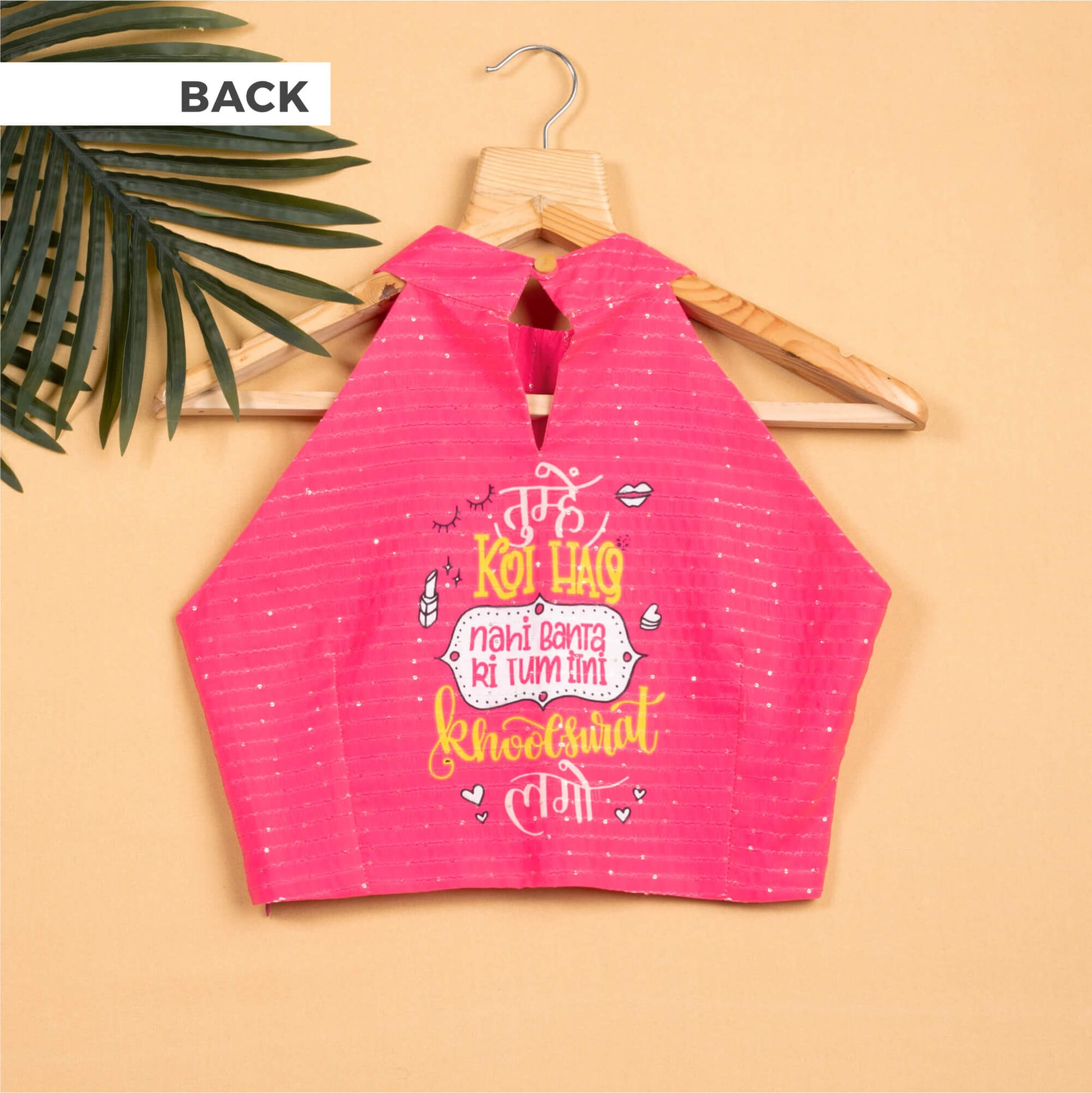 Butter Crepe Blouse in Quirky pattern looks wonderful. It features halter neckline and is sleeveless. The fabric is soft and lightweight making it comfortable to wear. Suit this blouse with a saree and arrive in style.