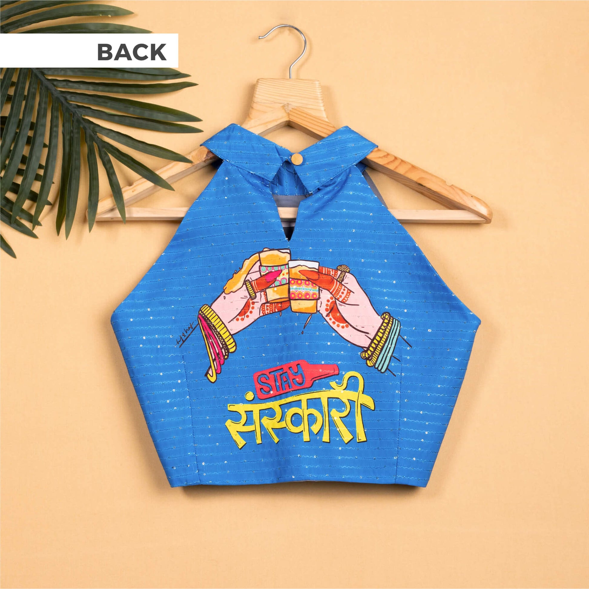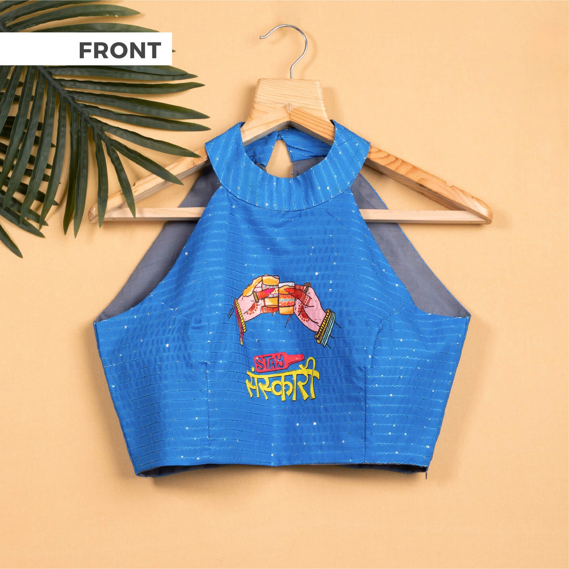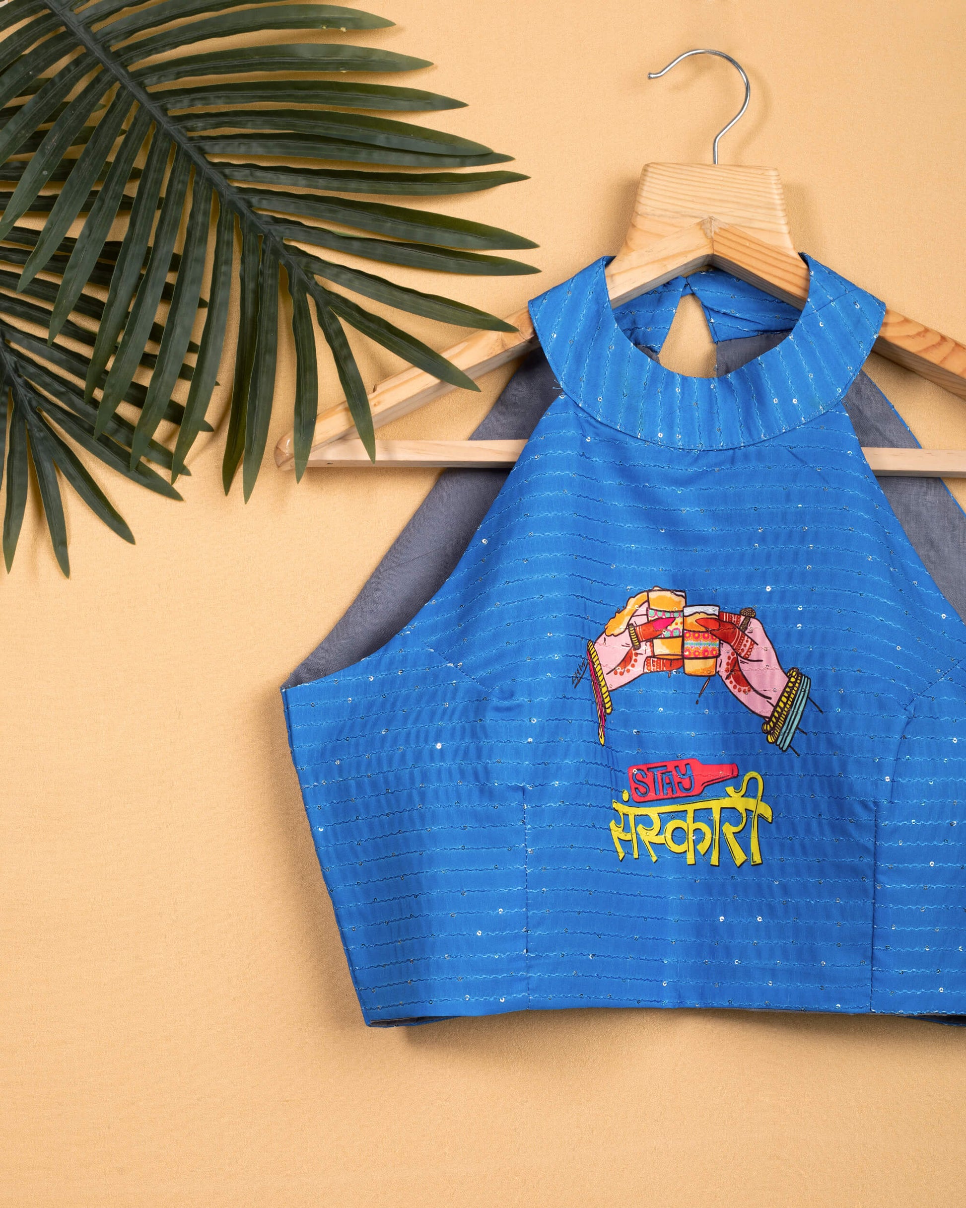 Quirky Printed Sequins Embroidery Halter Neck Blouse