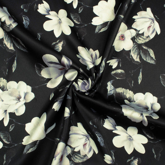 -10% offBlack And Off White Floral Pattern Digital Print Japan Satin Fabric Black And Off White Floral Pattern Digital Print Japan Satin Fabric