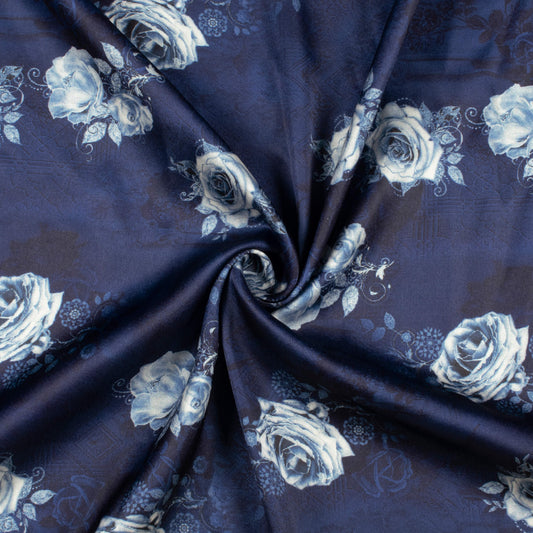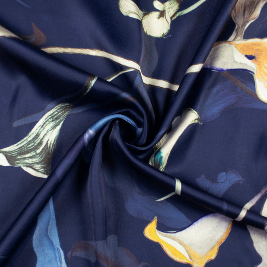-10% offNavy Blue And Off White Floral Pattern Digital Print Japan Satin Fabric Navy Blue And Off White Floral Pattern Digital Print Japan Satin Fabric