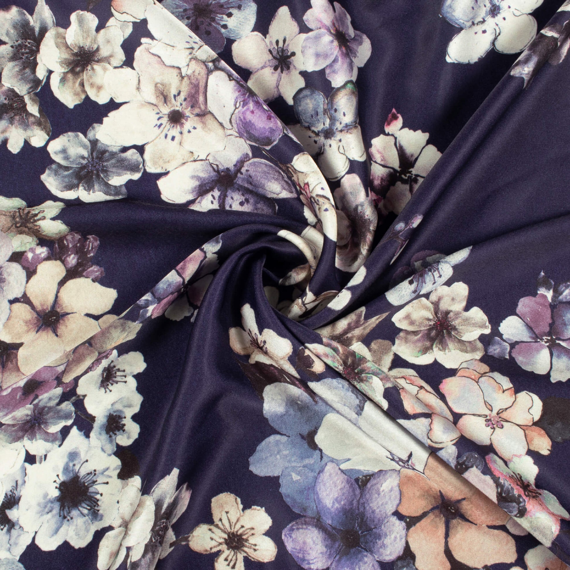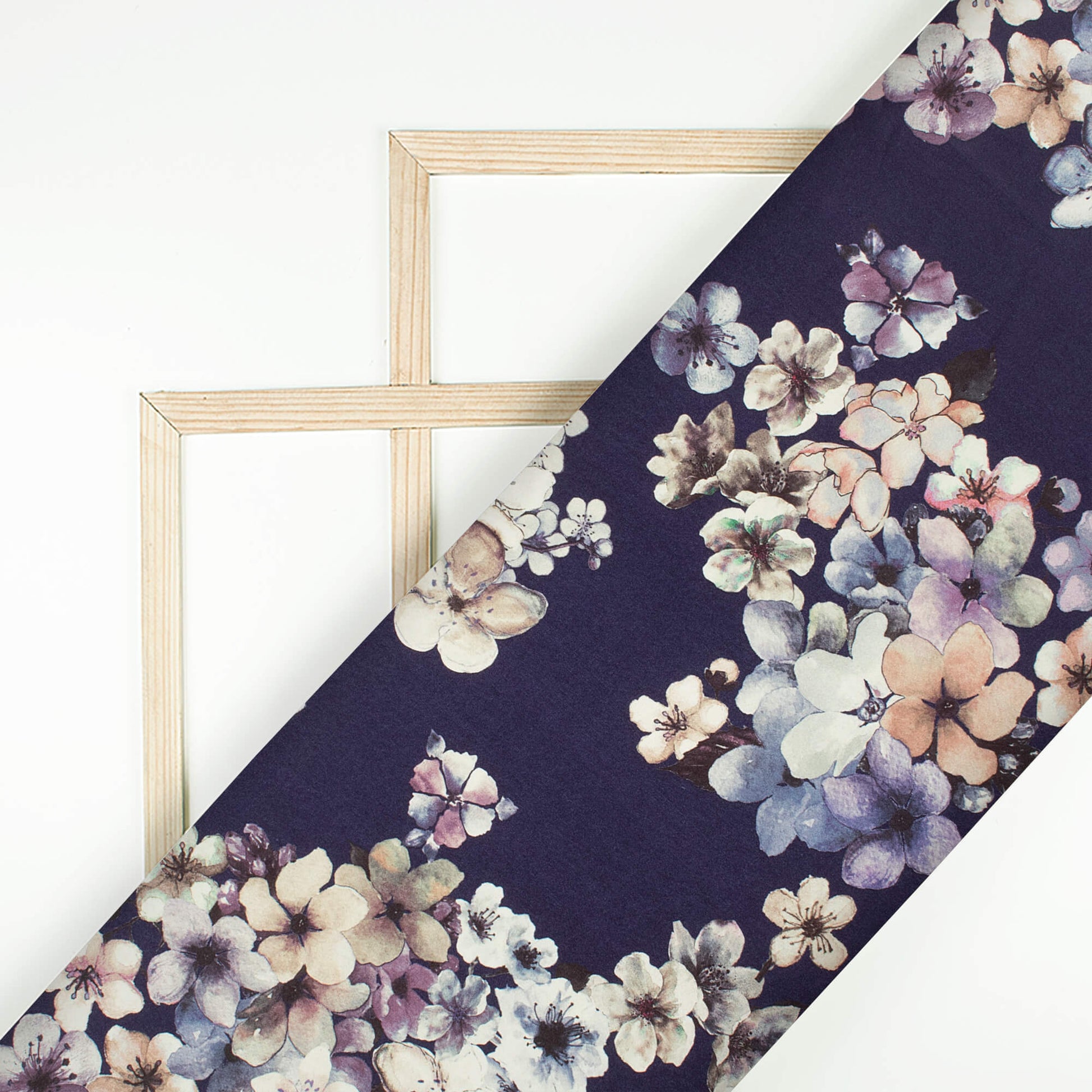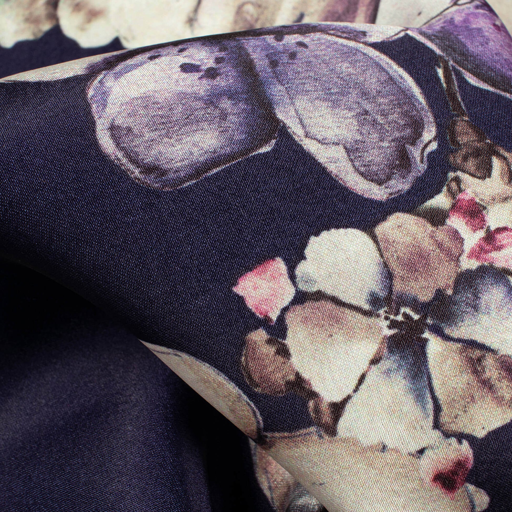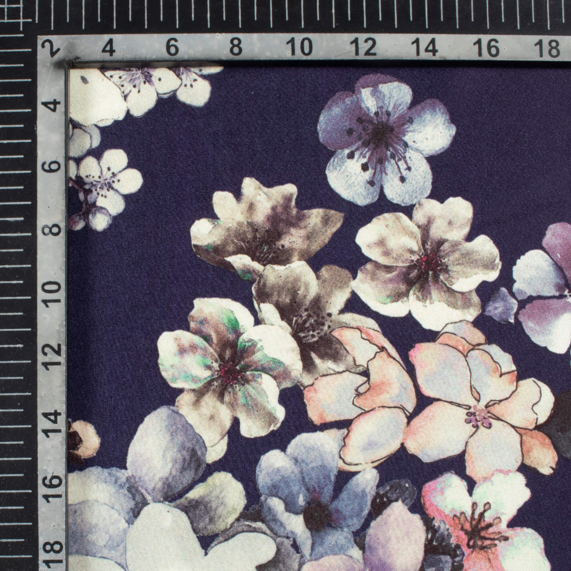 Navy Blue And Off White Floral Pattern Digital Print Japan Satin Fabric
