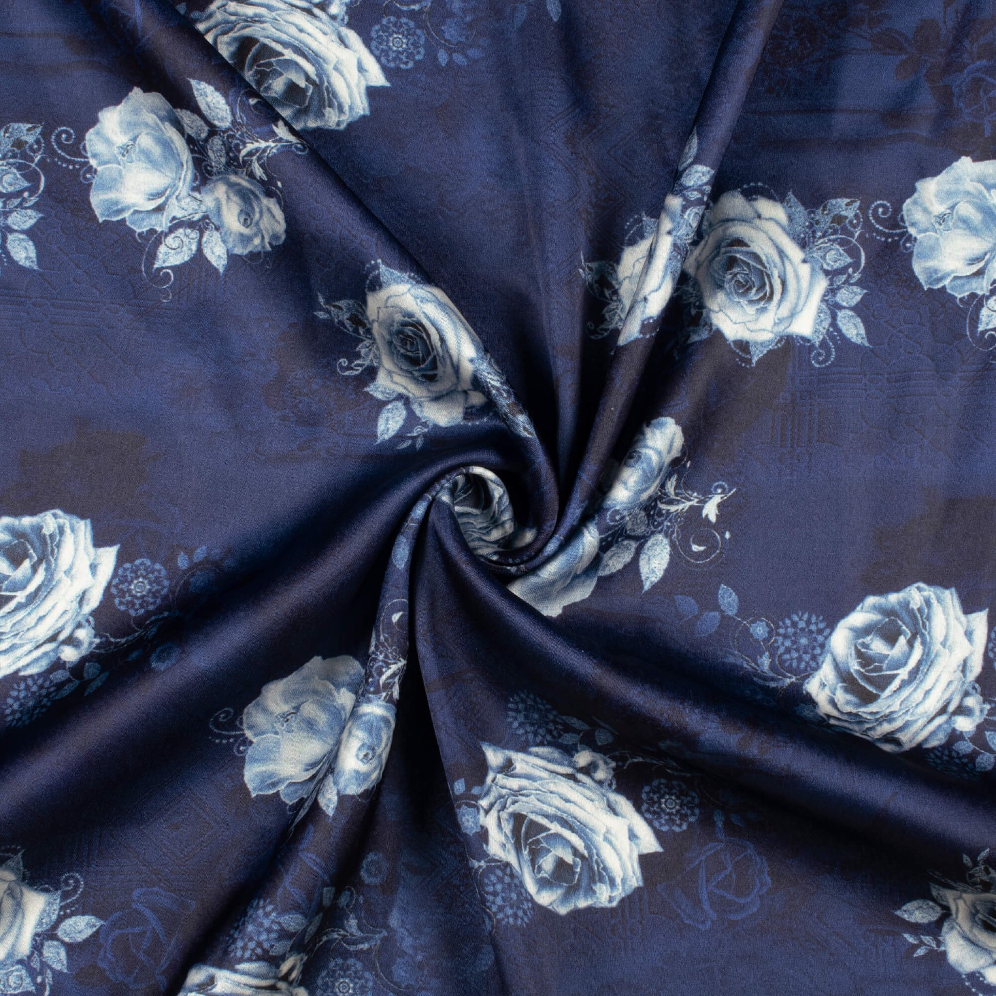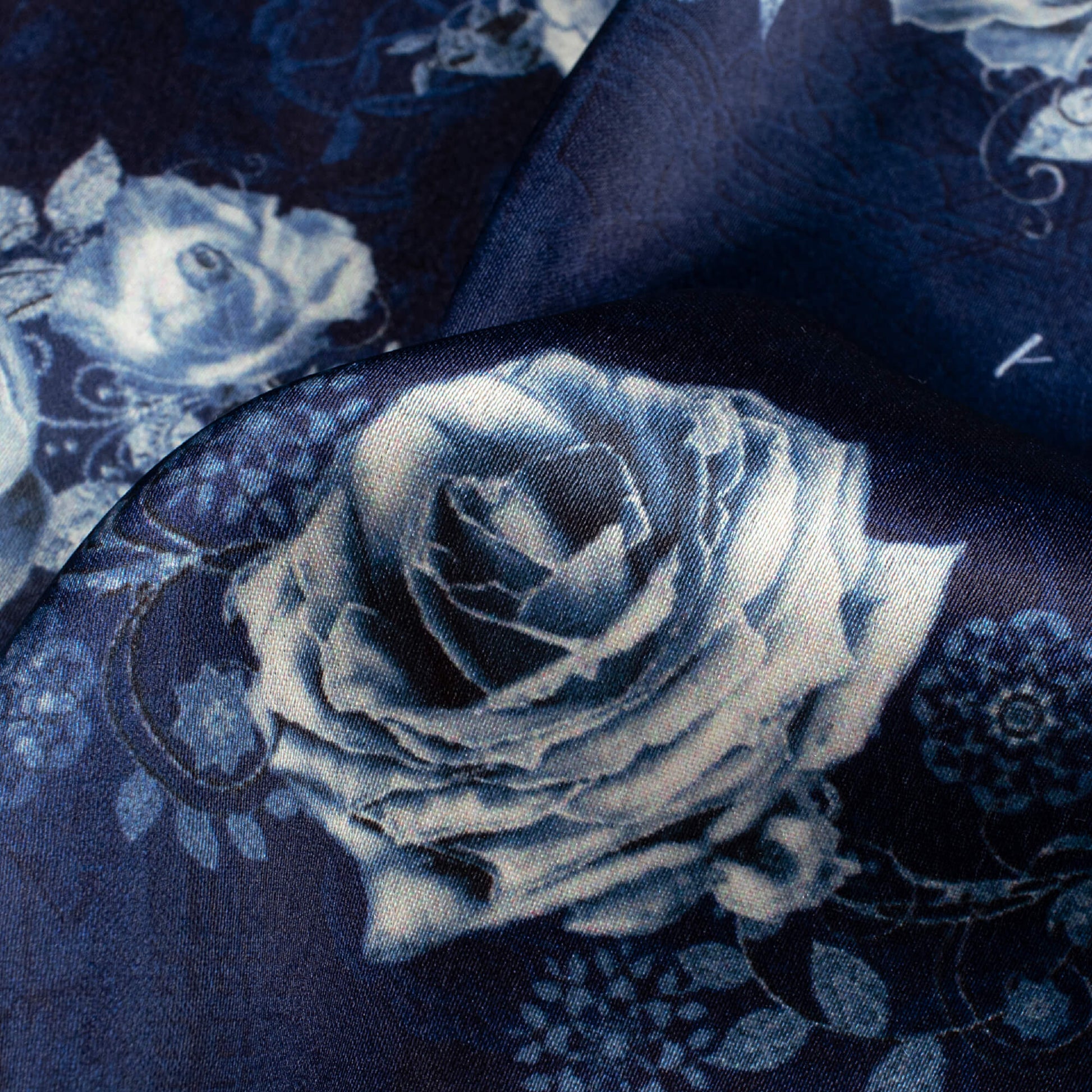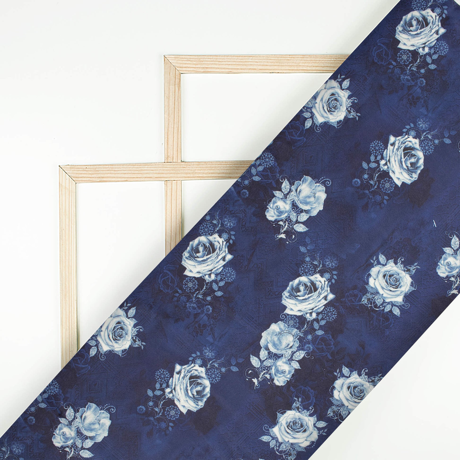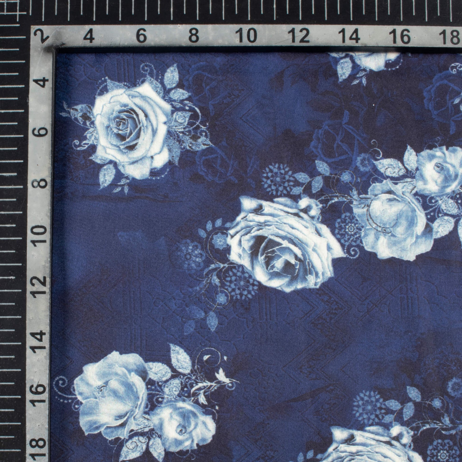 Prussian Blue And Pearl White Floral Pattern Digital Print Japan Satin Fabric