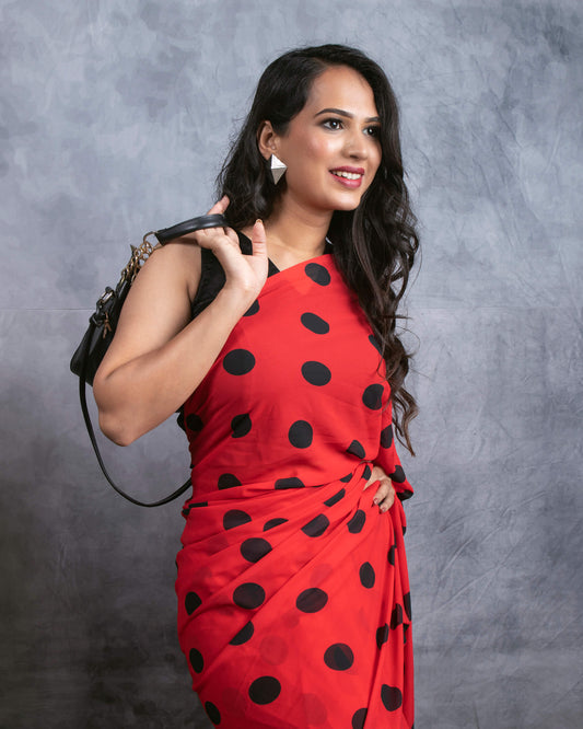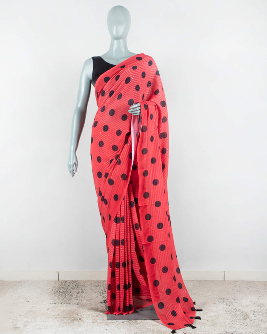Red And Black Polka Dots Pattern Digital Print Georgette Saree With Tassels Red And Black Polka Dots Pattern Digital Print Georgette Saree With Tassels