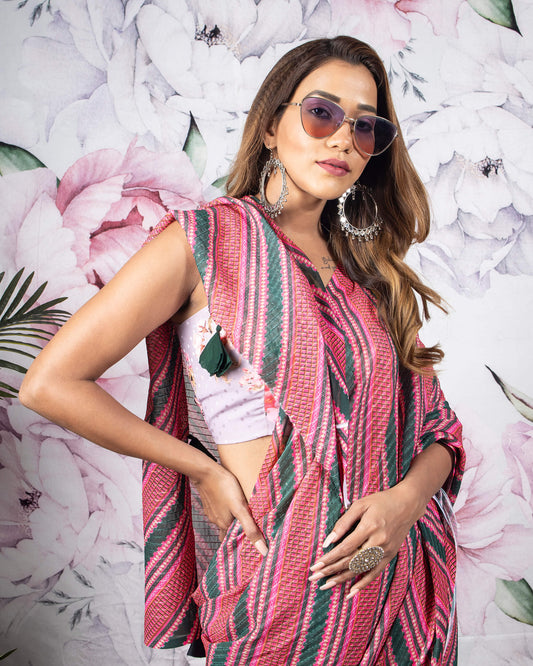 Hot Pink And White Stripes Pattern Digital Print Georgette Saree With Zari Sequins Lace Border Hot Pink And White Stripes Pattern Digital Print Georgette Saree With Zari Sequins Lace Border