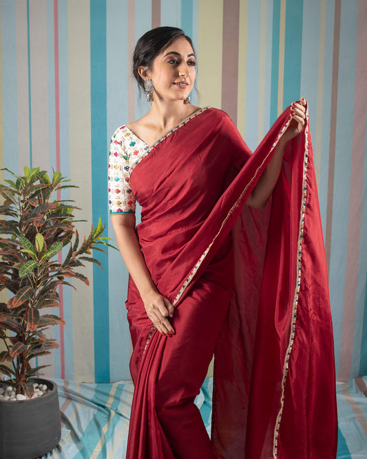 Mehogany Red Golden Zari Gotta Patti Work Liquid Organza Saree With Tubular Beads Sequins Lace Border. Mehogany Red Golden Zari Gotta Patti Work Liquid Organza Saree With Tubular Beads Sequins Lace Border.