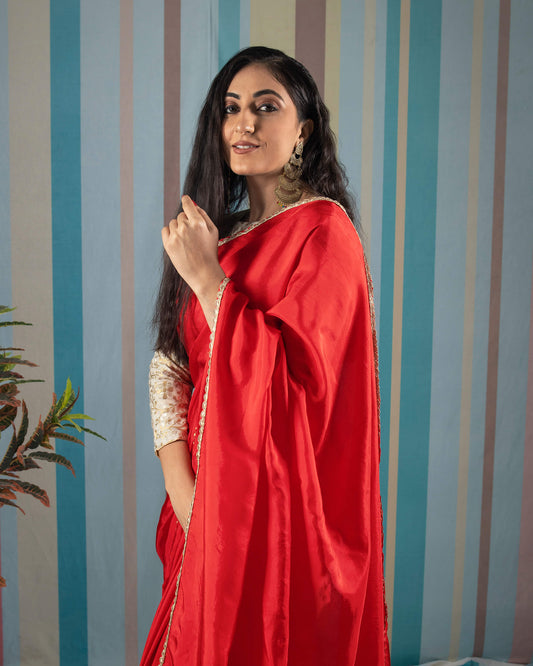 -20% offChilli Red Plain Japan Satin Saree With Lace Border Chilli Red Plain Japan Satin Saree With Lace Border
