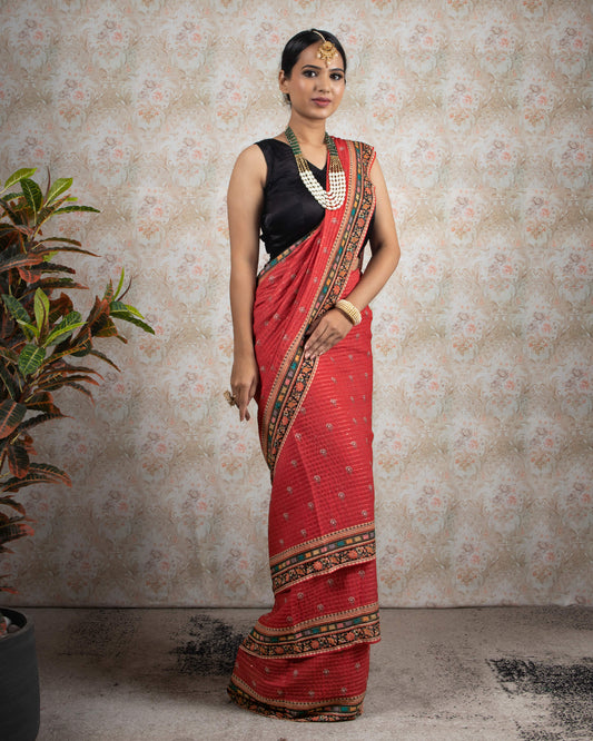 Barn Red And Green Bandhanii Pattern Digital Print Georgette Saree With Premium Lace Barn Red And Green Bandhanii Pattern Digital Print Georgette Saree With Premium Lace