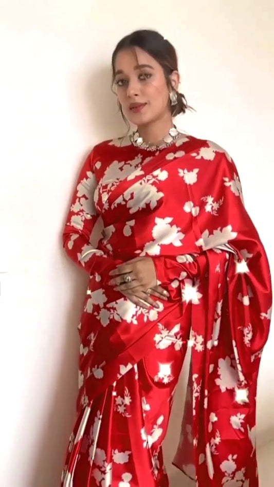 -20% offVermilion Red And Pearl Grey Floral Pattern Digital Print Japan Satin Saree Vermilion Red And Pearl Grey Floral Pattern Digital Print Japan Satin Saree