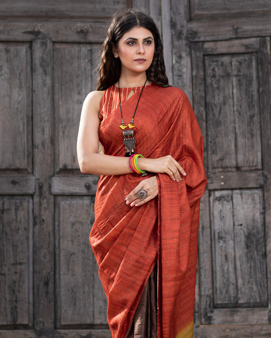 Brick Red And Umber Brown Ombre Pattern Digital Print Art Tusser Silk Saree With Tassels Brick Red And Umber Brown Ombre Pattern Digital Print Art Tusser Silk Saree With Tassels