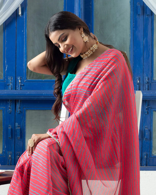 Deep Pink And Turquoise Leheriya Pattern Digital Print Kota Doria Saree With Zari Lace Border Deep Pink And Turquoise Leheriya Pattern Digital Print Kota Doria Saree With Zari Lace Border