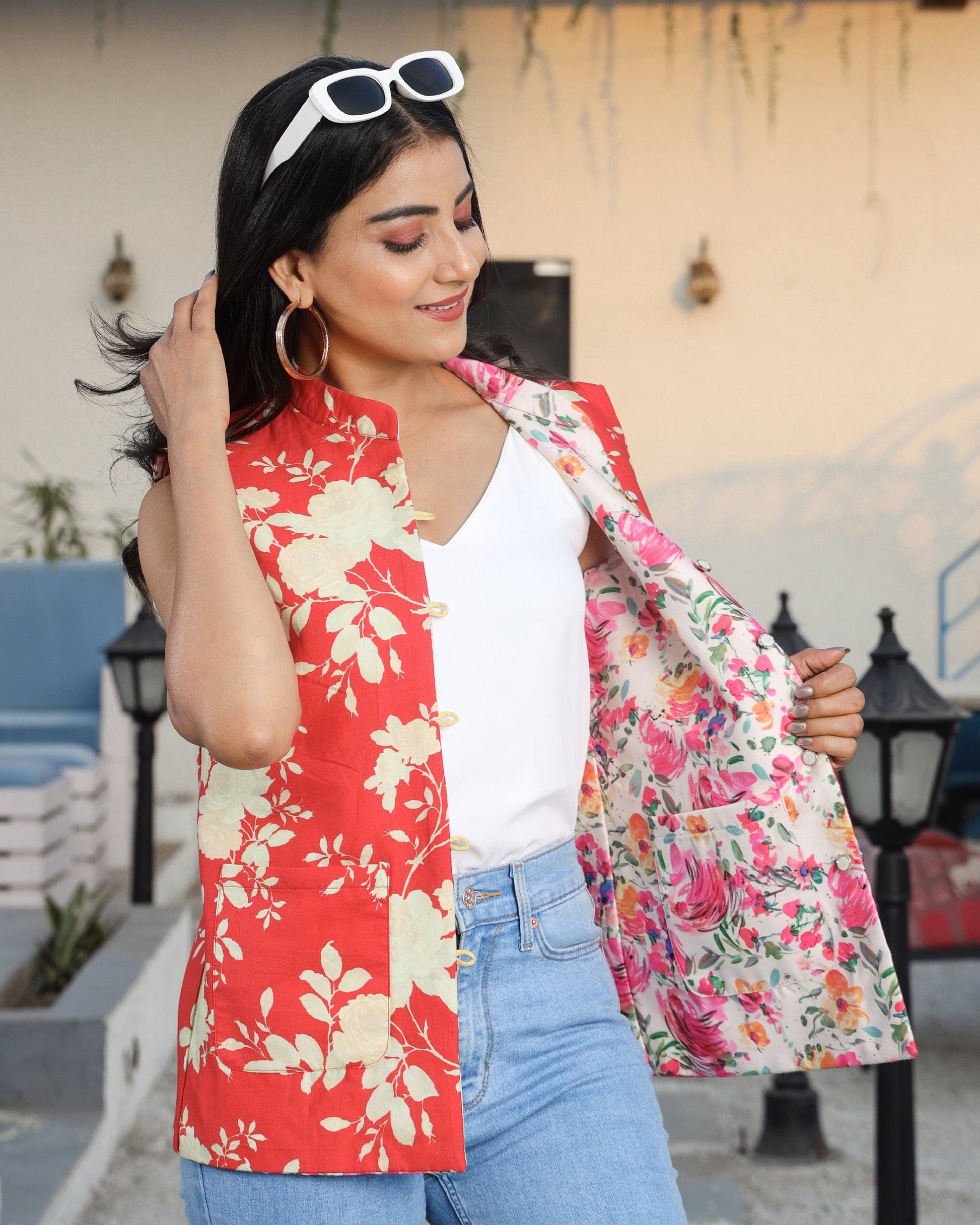 Unleash your style versatility with our Rayon Sleeveless Reversible Jacket. The smooth, breathable rayon fabric ensures comfort, while the reversible design adds a touch of adaptability to your wardrobe. Get two looks in one garment – timeless sophistication on one side and a contemporary twist on the other. Featuring the iconic Nehru collar, giving the jacket a classic and elegant touch.