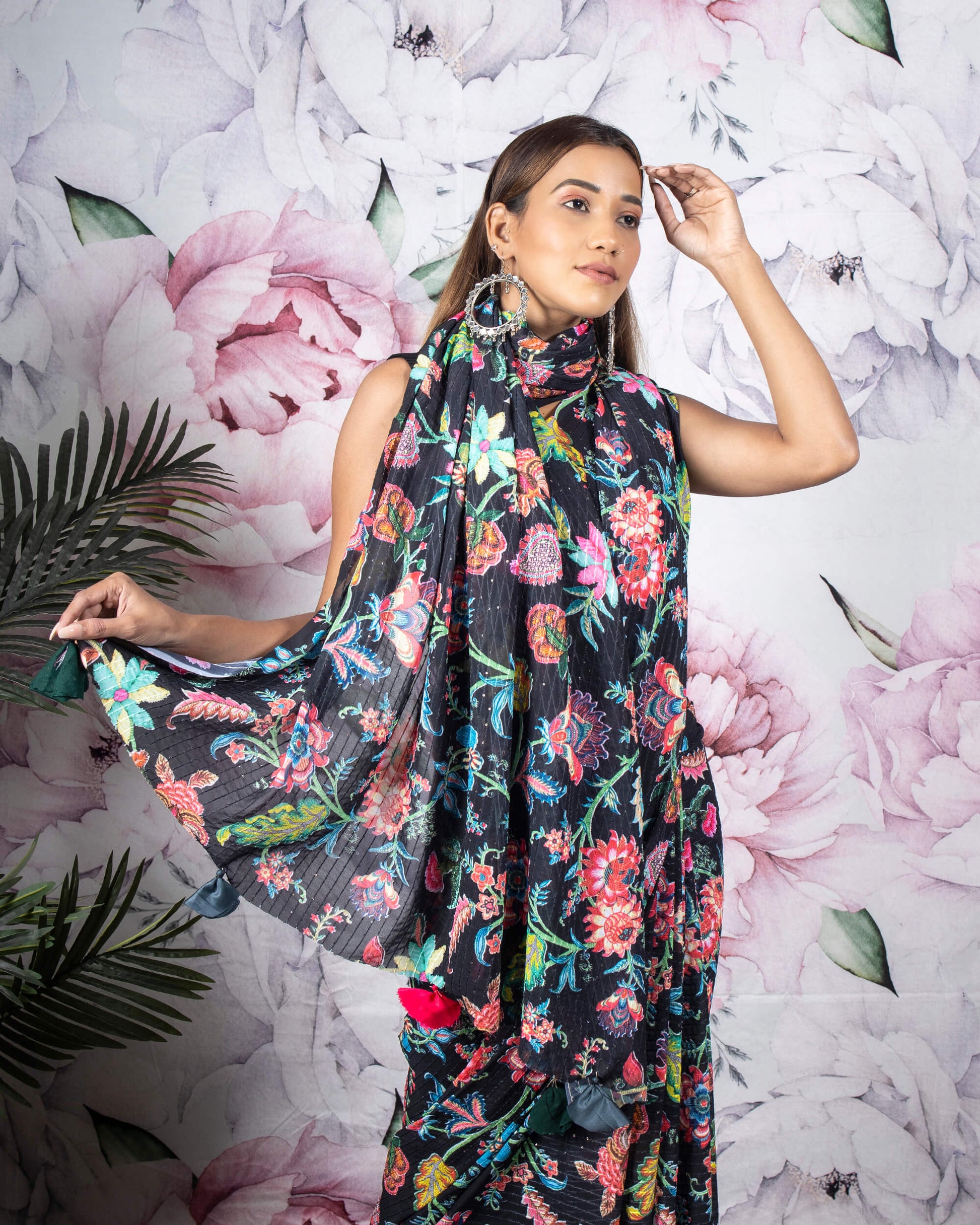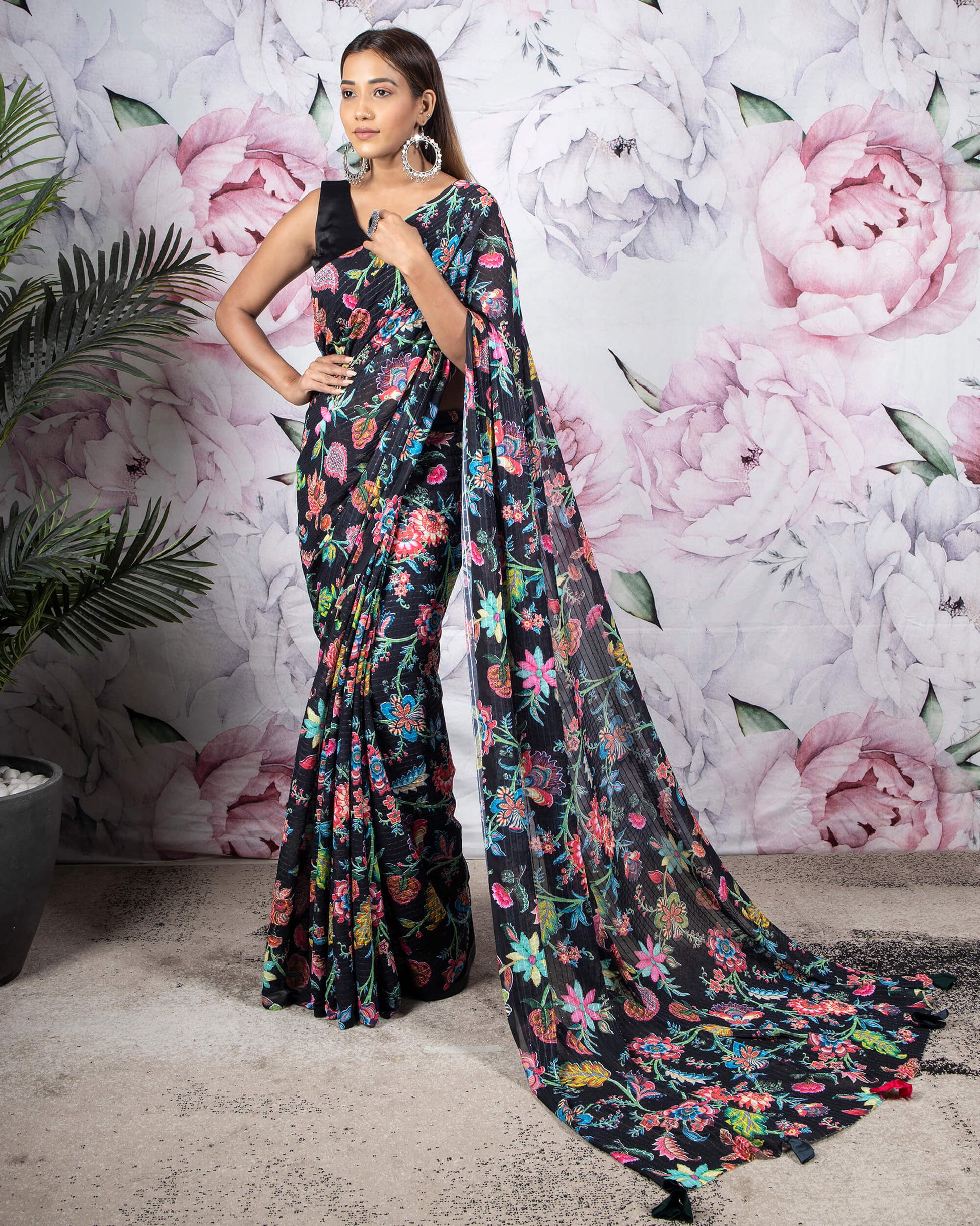 Black And Pink Floral Pattern Sequins Georgette Saree With Tassels