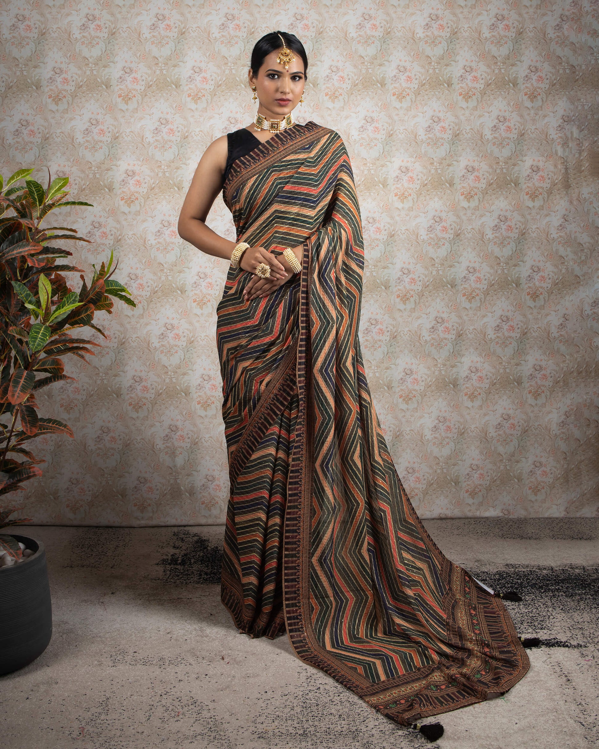 Bottle Green And Pink Chevron Pattren Sequins Georgette Saree With Tassels