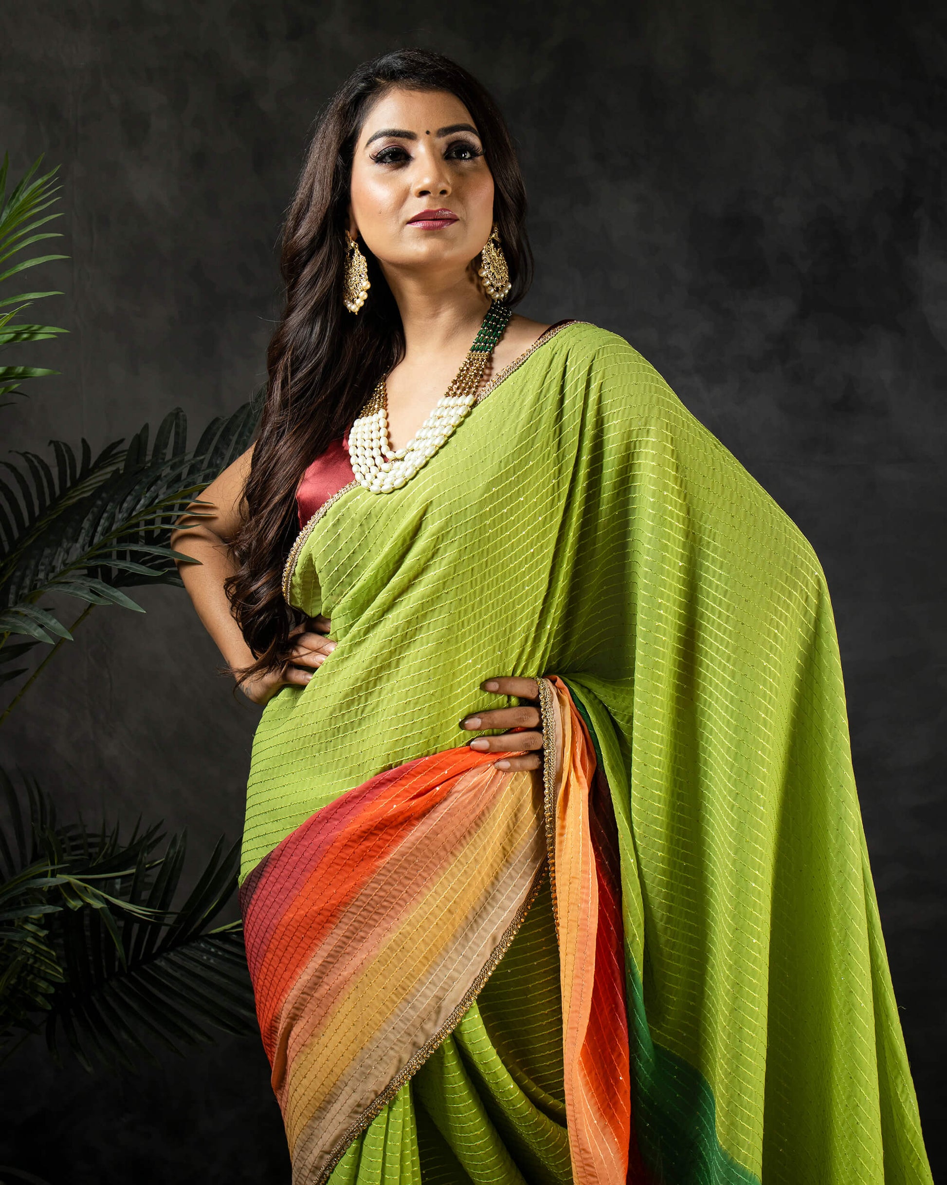 Green And Red Ombre Pattern Premium Sequins Georgette Saree With Stone Work Lace Border